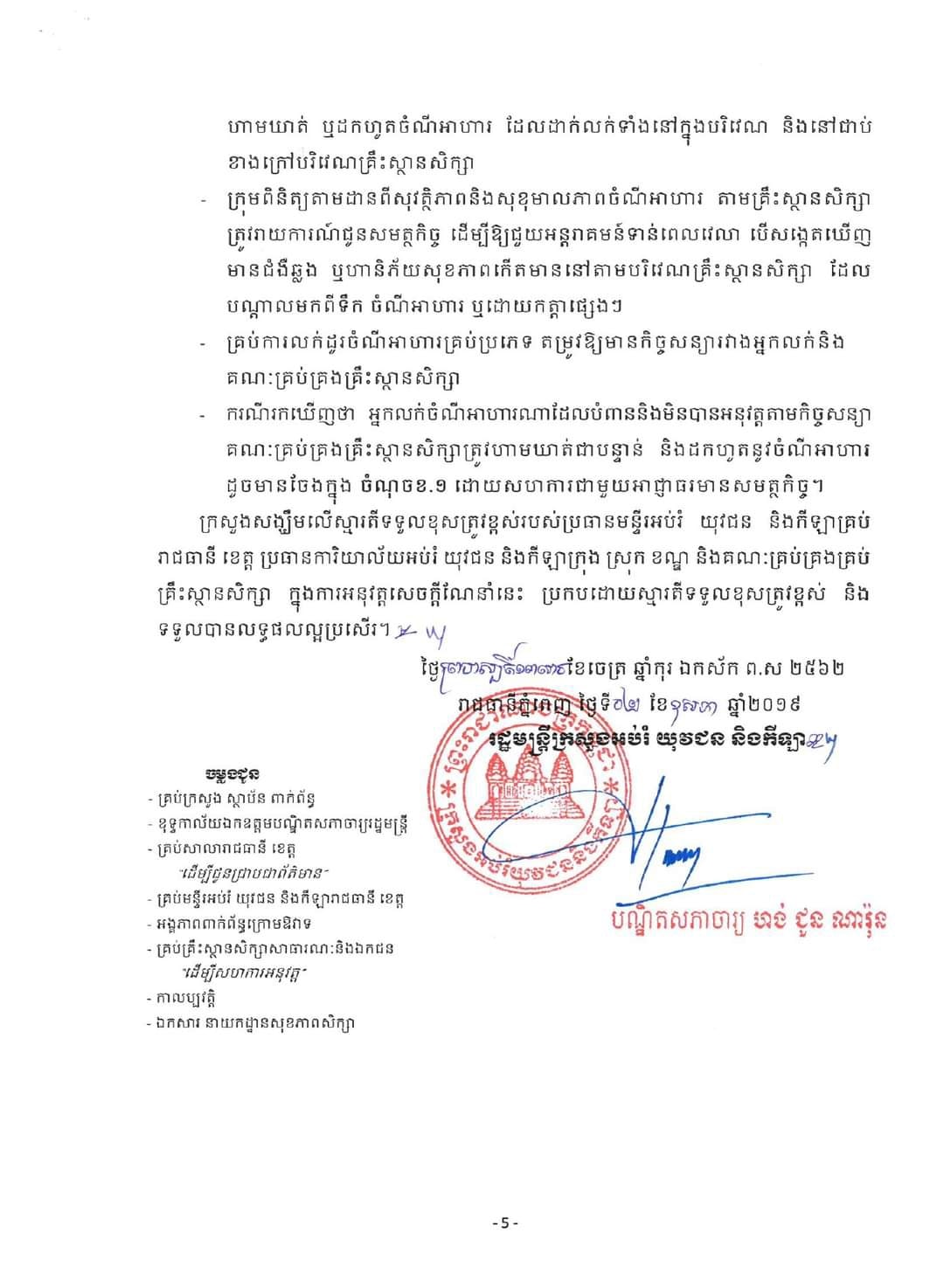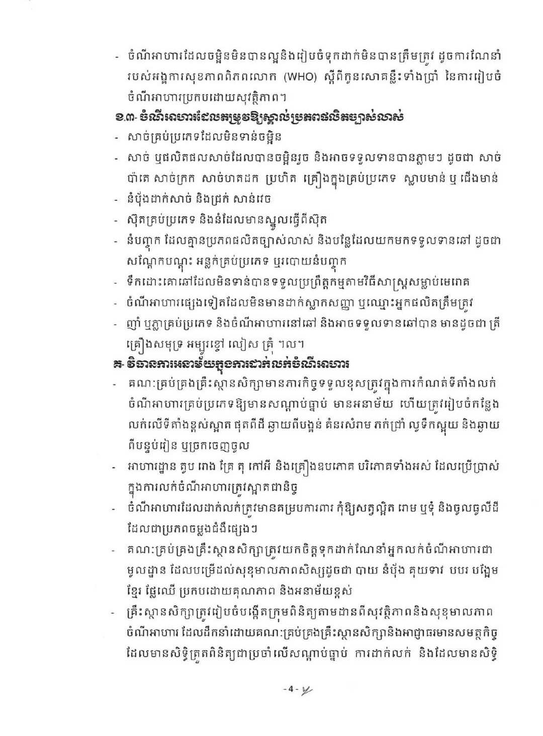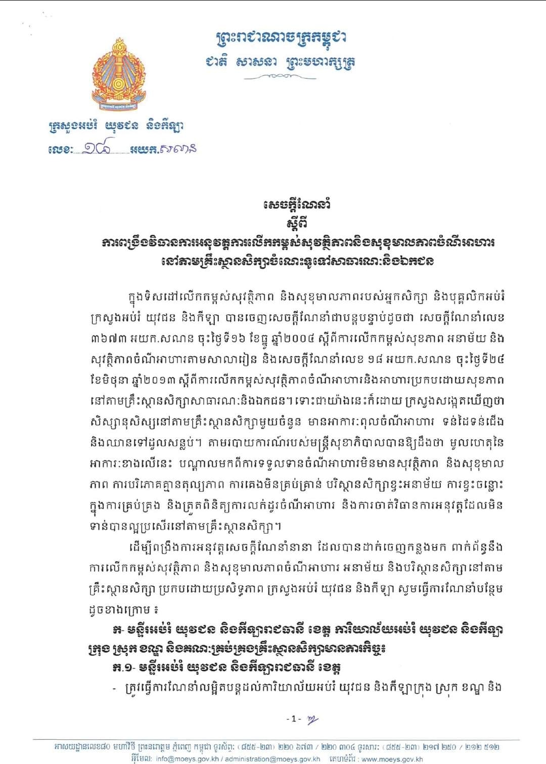 ដើម្បីពង្រឹងការអនុវត្តសេចក្តីណែនាំនានា ដែលបានដាក់ចេញកន្លងមក ពាក់ព័ន្ធនឹង ការលើកកម្ពស់សុវត្ថិភាព និងសុខុមាលភាពចំណីអាហារ អនាម័យ និងបរិស្ថានសិក្សានៅតាម គ្រឹះស្ថានសិក្សា ប្រកបដោយប្រសិទ្ធភាព ក្រសួងអប់រំ យុវជន និងកីឡា សូមធ្វើការណែនាំបន្ថែមដូចខាងក្រោម៖