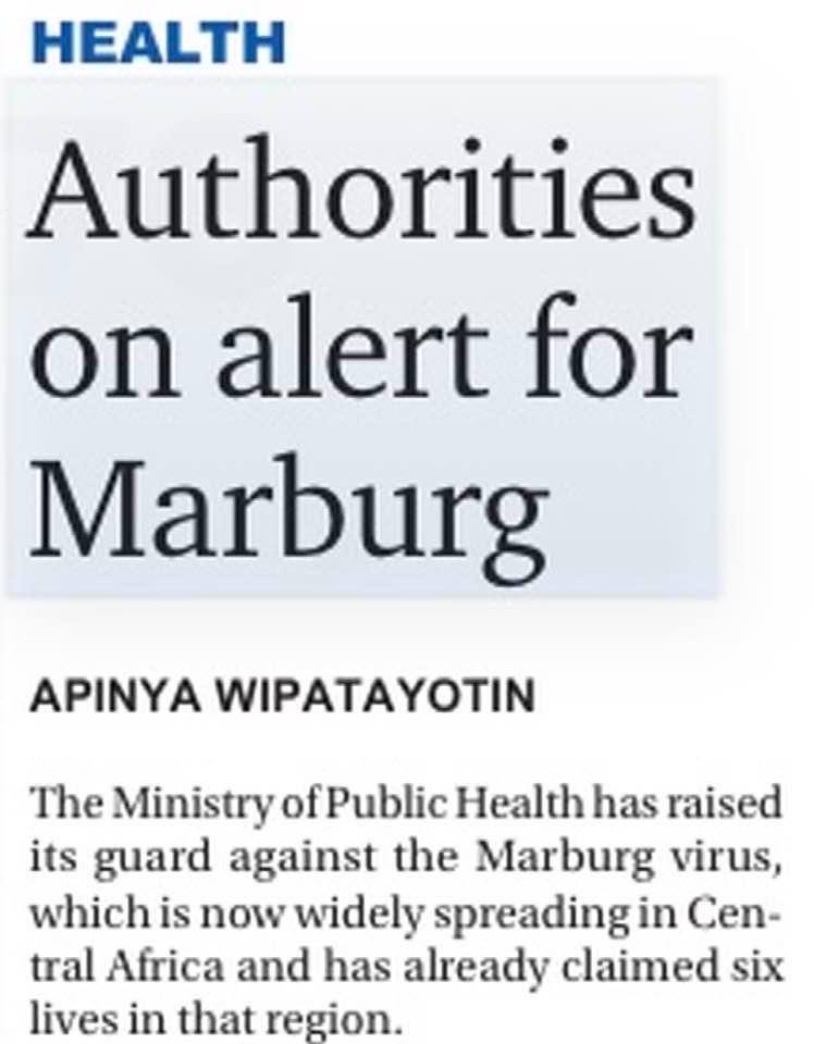 ថៃ៖ យោងតាមការចុះផ្សាយរបស់ ទូរទស្សន៍ជាតិកម្ពុជា ទទក នៅថ្ងៃទី១៧ ខែកុម្ភៈ ឆ្នាំ២០២៣ បានឱ្យដឹងថា ក្រសួងសុខាភិបាលសាធារណៈរបស់ប្រទេសថៃ បានប្រកាសសូមឲ្យបង្កើនការប្រុងប្រយ័ត្នចំពោះការបង្ហាញខ្លួននៃវីរុសប្រភេទថ្មីដែលមានឈ្មោះថា Marburg ដើម្បីប្រឆាំងនឹងវត្តមាននៃមេរោគនេះ។