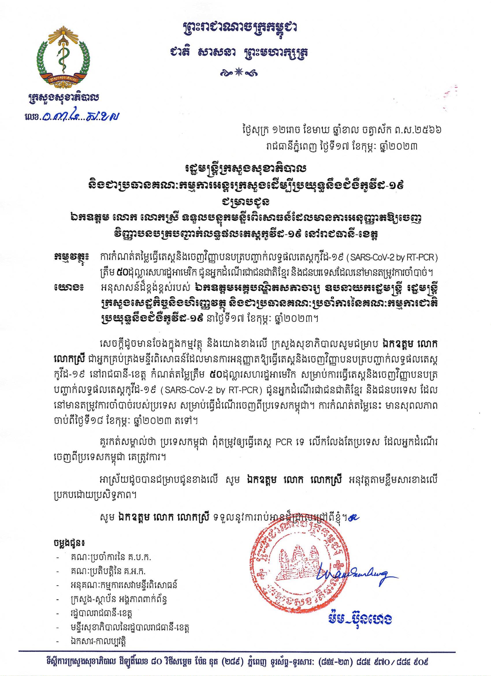 ក្រសួងសុខាភិបាលសូមជម្រាប ឯកឧត្តម លោក លោកស្រី ជាអ្នកគ្រប់គ្រងមន្ទីរពិសោធន៍ដែលមានការអនុញ្ញាតឱ្យធ្វើតេស្តនិងចេញវិញ្ញាបនបត្របញ្ជាក់លទ្ធផលតេស្ត កូវីដ-១៩ នៅរាជធានី-ខេត្ត កំណត់តម្លៃត្រឹម ៥០ដុល្លារសហរដ្ឋអាមេរិក សម្រាប់ការធ្វើតេស្តនិងចេញវិញ្ញាបនបត បញ្ជាក់លទ្ធផលតេស្តកូវីដ-១៩ (SARS-CoV-2 by RT-PCR) ជូនអ្នកដំណើរជាជនជាតិខ្មែរ និងជនបរទេស ដែល នៅមានតម្រូវការចាំបាច់របស់ប្រទេស សម្រាប់ធ្វើដំណើរចេញពីប្រទេសកម្ពុជា។
