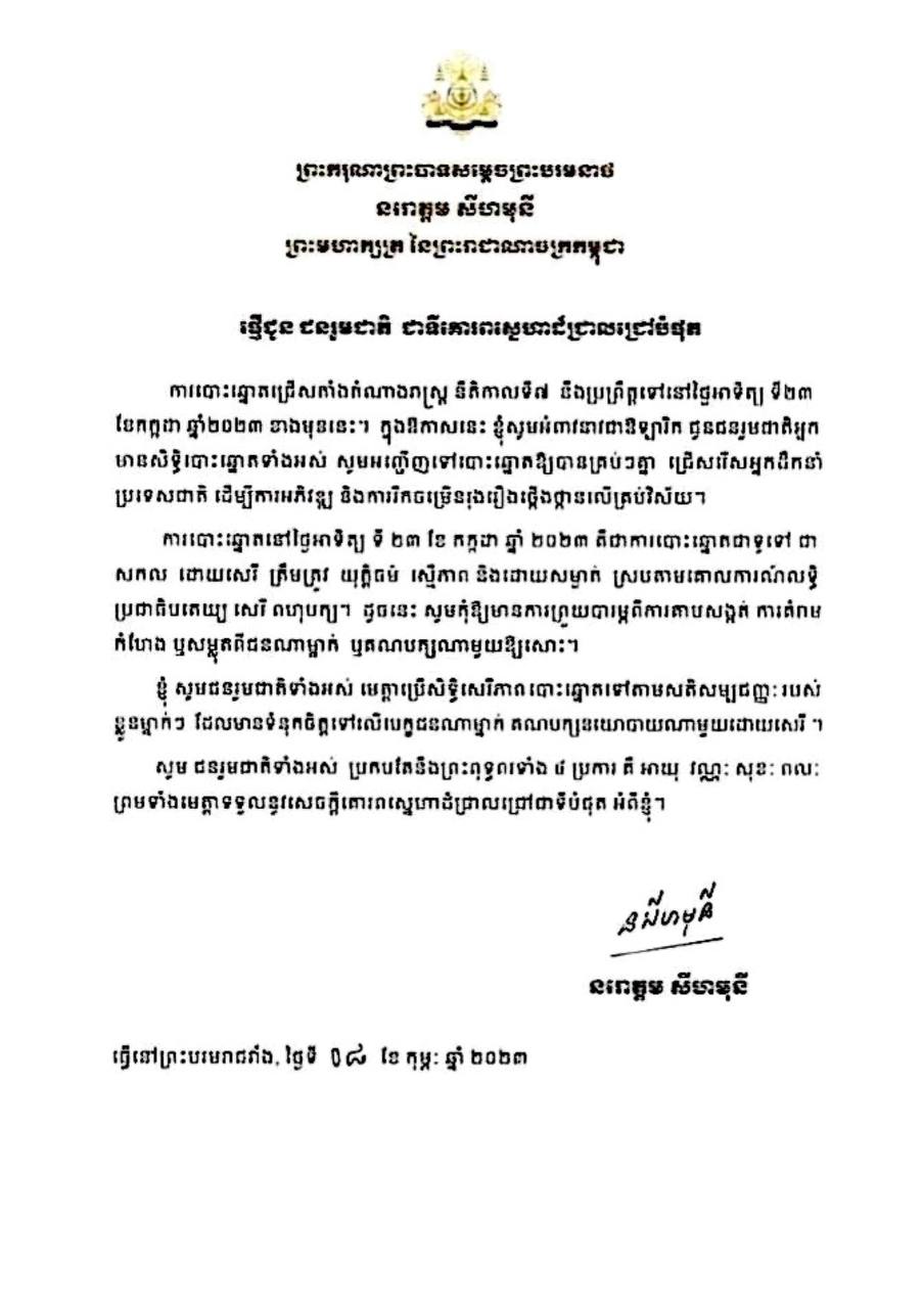 រាជធានីភ្នំពេញ៖ នៅថ្ងៃទី១៨ ខែកុម្ភៈ ឆ្នាំ២០២៣ ព្រះករុណា ព្រះបាទ សម្តេចព្រះបរមនាថ នរោត្តម សីហមុនី ព្រះមហាក្សត្រខ្មែរ ព្រះរាជអំពាវនាវឱ្យប្រជាពលរដ្ឋខ្មែរ ទៅចូលរួមបោះឆ្នោតជ្រើសតាំងតំណាងរាស្ត្រអាណត្តិទី៧ នាថ្ងៃទី២៣ ខែកក្កដា ឆ្នាំ២០២៣ខាងមុខនេះ។