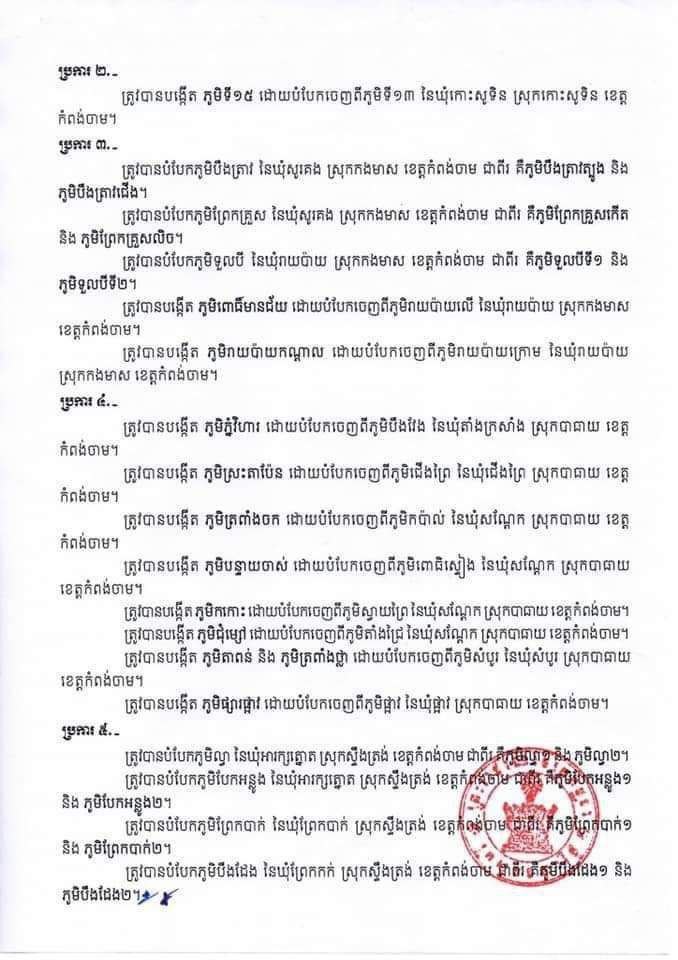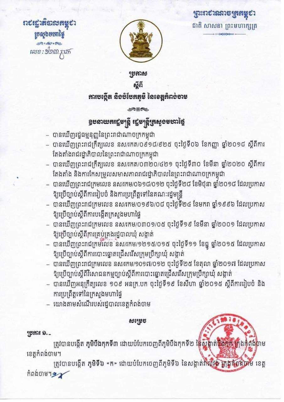 ប្រការទី១៖ ត្រូវបានបង្កើត ភូមិបឹងកុកទី៣ ដោយបំបែកចេញពីភូមិបឹងកុកទី២ នៃសង្កាត់បឹងកុក ក្រុងកំពង់ចាម។ សម្រេចបង្កើត ភូមិទី៦ «ក» ដោយបំបែកចេញពីភូមិទី៦ នៃសង្កាត់វាលវង់ ក្រុងកំពង់ចាម ខេត្តកំពង់ចាម។