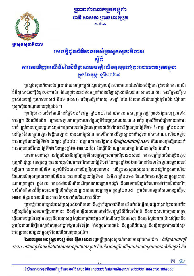 ក្រសួងសុខាភិបាល ចេញសេចក្ដីប្រកាសព័ត៌មានរកឃើញករណីទី១ នៃជំងឺផ្តាសាយបក្សី H5N1 លើមនុស្សនៅកម្ពុជា