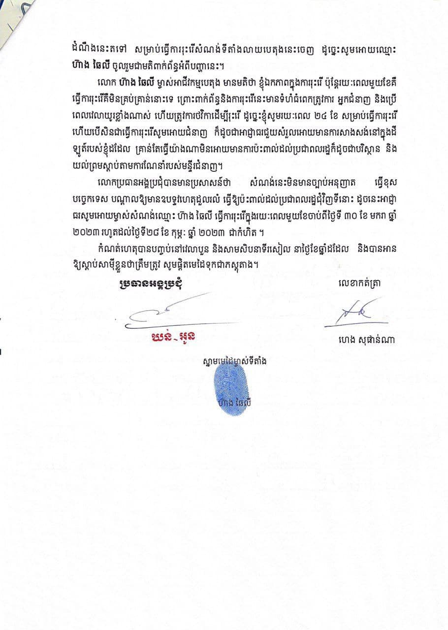 ដូចនេះ រដ្ឋបាលខេត្តបានសម្រេចមិនអនុញ្ញាតឱ្យបន្តសុពលភាពអាជីវកម្មការដ្ឋានសំណង់បេតុងលាយស្រេចរបស់ ឈ្មោះ ហ៊ាង ឆៃលី និងរុះរើការដ្ឋានឱ្យហើយត្រឹមថ្ងៃទី២៨ ខែកុម្ភៈ ឆ្នាំ២០២៣ ជាកំហិត ប្រសិនបើម្ចាស់ សំណង់មិនអនុវត្តតាមការជូនដំណឹង ក្រុមការងារនឹងចុះអនុវត្តរុះរើ ហើយសោហ៊ុយ និងតម្លៃពលកម្មជា បន្ទុកចំណាយរបស់ម្ចាស់សាមី ដោយត្រូវពិន័យប្រាក់ជាអន្តរការណ៍បន្ថែម។