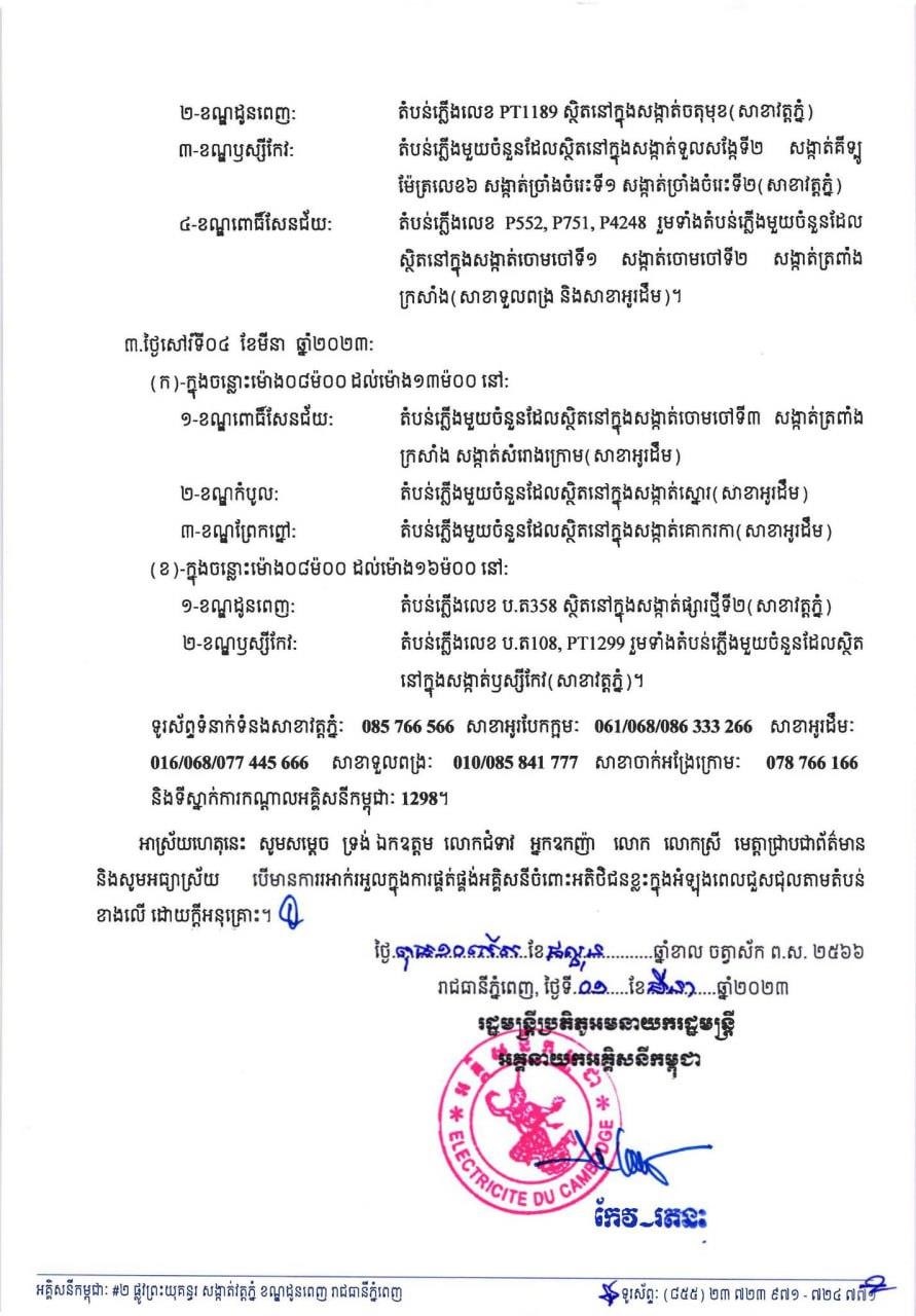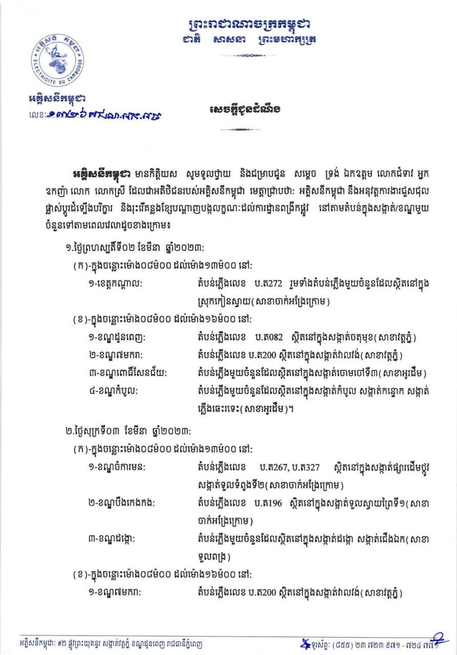 រាជធានីភ្នំពេញ៖ នៅថ្ងៃទី០២ ខែមីនា ឆ្នាំ២០២៣ យោងតាមការចុះផ្សាយរបស់ អគ្គិសនីកម្ពុជា បានចេញសេចក្តីជូនដំណឹងស្តីពីការអនុវត្តការងារជួសជុល ផ្លាស់ប្តូរតម្លើងបរិក្ខារនានា និងរុះរើគន្លងខ្សែបណ្តាញអគ្គិសនីរបស់អគ្គិសនីកម្ពុជា ដើម្បីបង្កលក្ខណៈងាយស្រួលដល់ការដ្ឋានពង្រីកផ្លូវ ចាប់ពីថ្ងៃនេះ ដល់ថ្ងៃទី០៤ ខែមីនា ឆ្នាំ២០២៣ នៅតំបន់មួយចំនួនទៅតាមពេលវេលា និងទីកន្លែងដូចសេចក្តីជូនដំណឹងលម្អិតខាងក្រោម។
