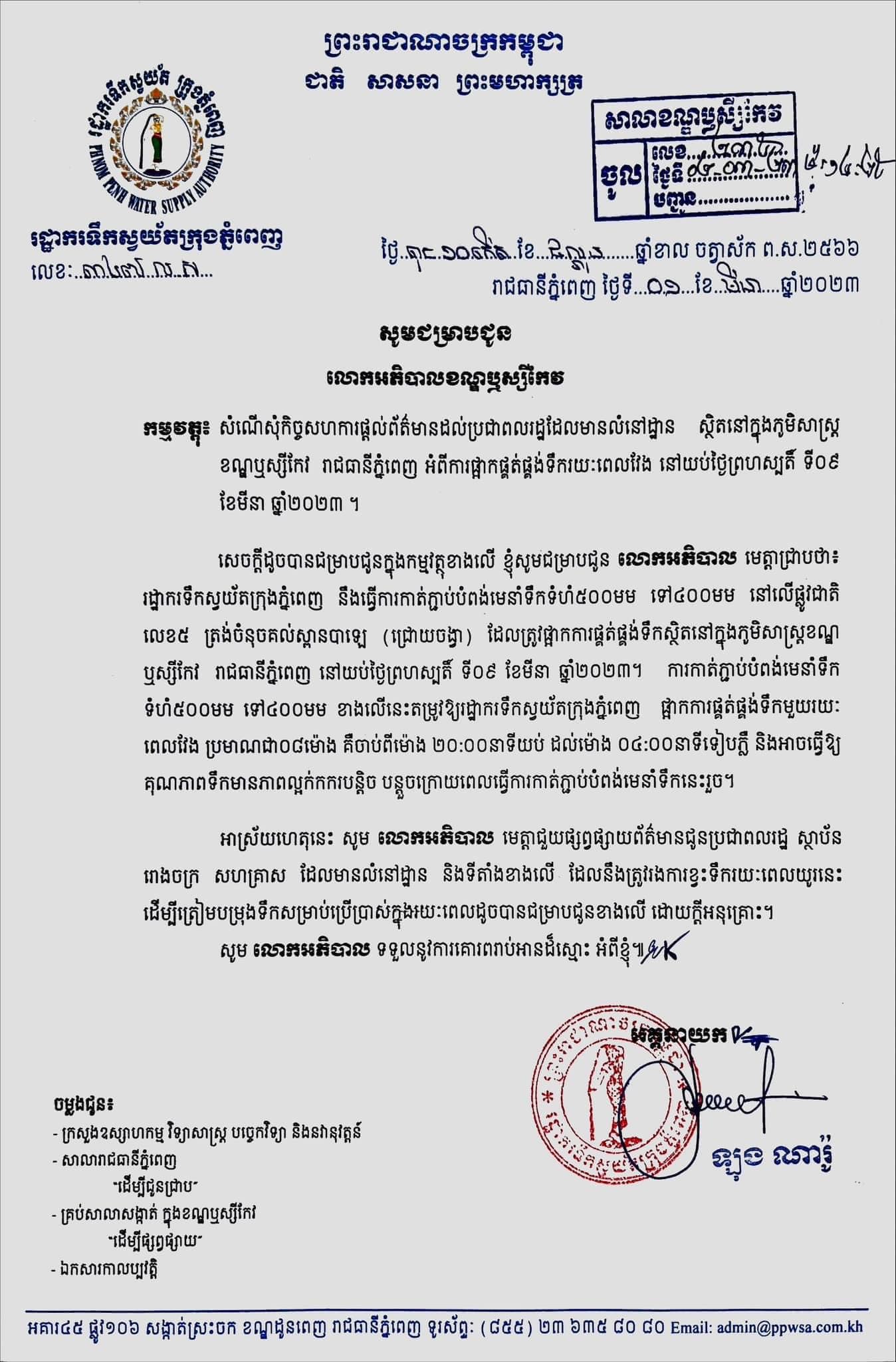 រដ្ឋបាលខណ្ឌឫស្សីកែវ សូមជូនដំណឹងដល់បងប្អូនប្រជាពលរដ្ឋក្នុងមូលដ្ឋានខណ្ឌឫស្សីកែវជ្រាបថា៖ រដ្ឋាករទឹកស្វយ័តក្រុងភ្នំពេញ នឹងធ្វើការកាត់ភ្ជាប់បំពង់មេនាំទឹកទំហំ ៥០០មម ទៅ៤០០មម នៅលើផ្លូវជាតិលេខ៥ ត្រង់ចំនុចគល់ស្ពានបាឡេ (ជ្រោយចង្វារ) ដែលត្រូវផ្អាកការផ្គត់ផ្គង់ទឹកស្ថិតនៅក្នុងភូមិសាស្ត្រខណ្ឌឫស្សីកែវ រាជធានីភ្នំពេញ នៅយប់ថ្ងៃព្រហស្បតិ៍ ទី០៩ ខែមីនា ឆ្នាំ២០២៣។