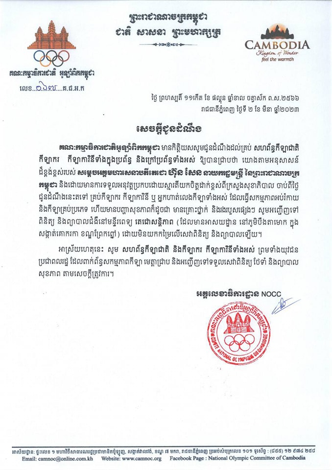 រាជធានីភ្នំពេញ៖ យោងតាមការចុះផ្សាយរបស់ គណៈកម្មាធិការជាតិ អូឡាំពិកកម្ពុជា នៅថ្ងៃទី០៣ ខែមីនា ឆ្នាំ២០២៣ បានចេញសេចក្ដីជូនដំណឹងដល់គ្រប់ សហព័ន្ធកីឡាជាតិ កីឡាករ កីឡាការិនីទាំងក្នុងប្រព័ន្ធ និងក្រៅប្រព័ន្ធទាំងអស់ ឱ្យបានជ្រាបថា៖