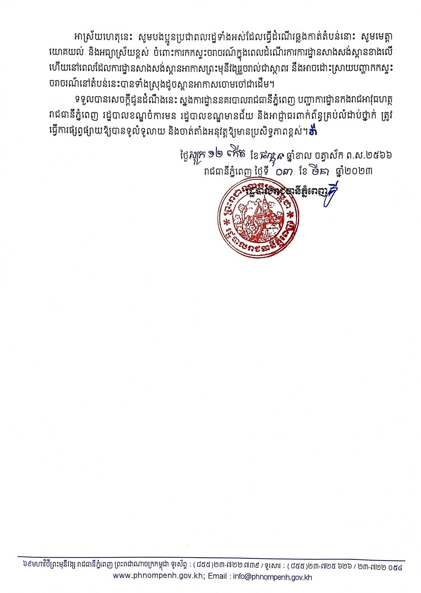 រាជធានីភ្នំពេញ៖ យោងតាមការចុះផ្សាយរបស់ រដ្ឋបាលរាជធានីភ្នំពេញ នៅថ្ងៃទី០៤ ខែមីនា ឆ្នាំ២០២៣ បានចេញសេចក្ដីស្តីពីលទ្ធផលនៃកិច្ចប្រជុំពិភាក្សាដោះស្រាយការកកស្ទះចរាចរណ៍ នៅការដា្ឋនសាងសង់ស្ពានអាកាសព្រះមុនីវង្ស។
