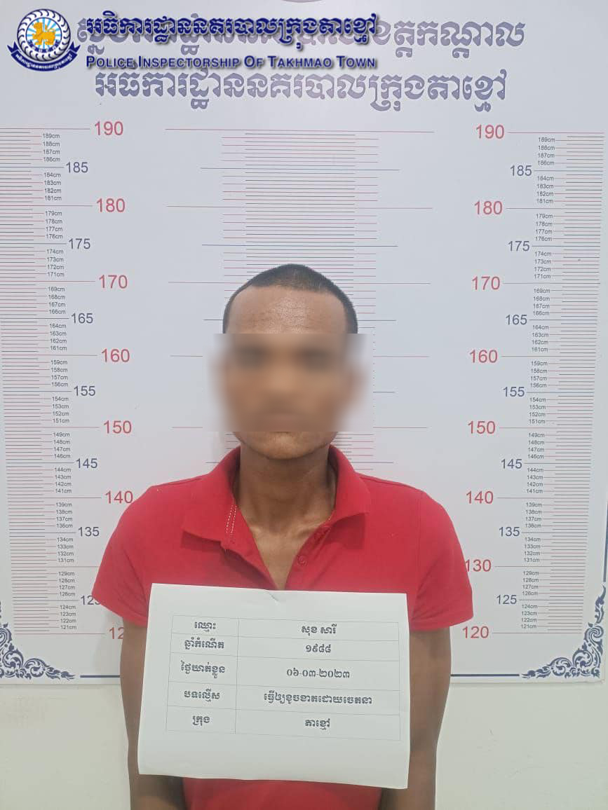 ក្រុងតាខ្មៅ៖ យោងតាមការចុះផ្សាយរបស់ អធិការដ្ឋាននគរបាលក្រុងតាខ្មៅ នៅថ្ងៃទី០៦ ខែមីនា ឆ្នាំ២០២៣ បានឱ្យដឹងថា ជនសង្ស័យ ដែលបានយកដុំថ្មគប់ទៅលើរថយន្តរបស់បងប្អូនប្រជាពលរដ្ឋតាមផ្លូវ ចំណុចលើស្ពានព្រែកហូរ កាលពីយប់ថ្ងៃទី០៥ ខែមីនា ឆ្នាំ២០២៣ ត្រូវបានឃាត់ខ្លួនភ្លាមៗ។