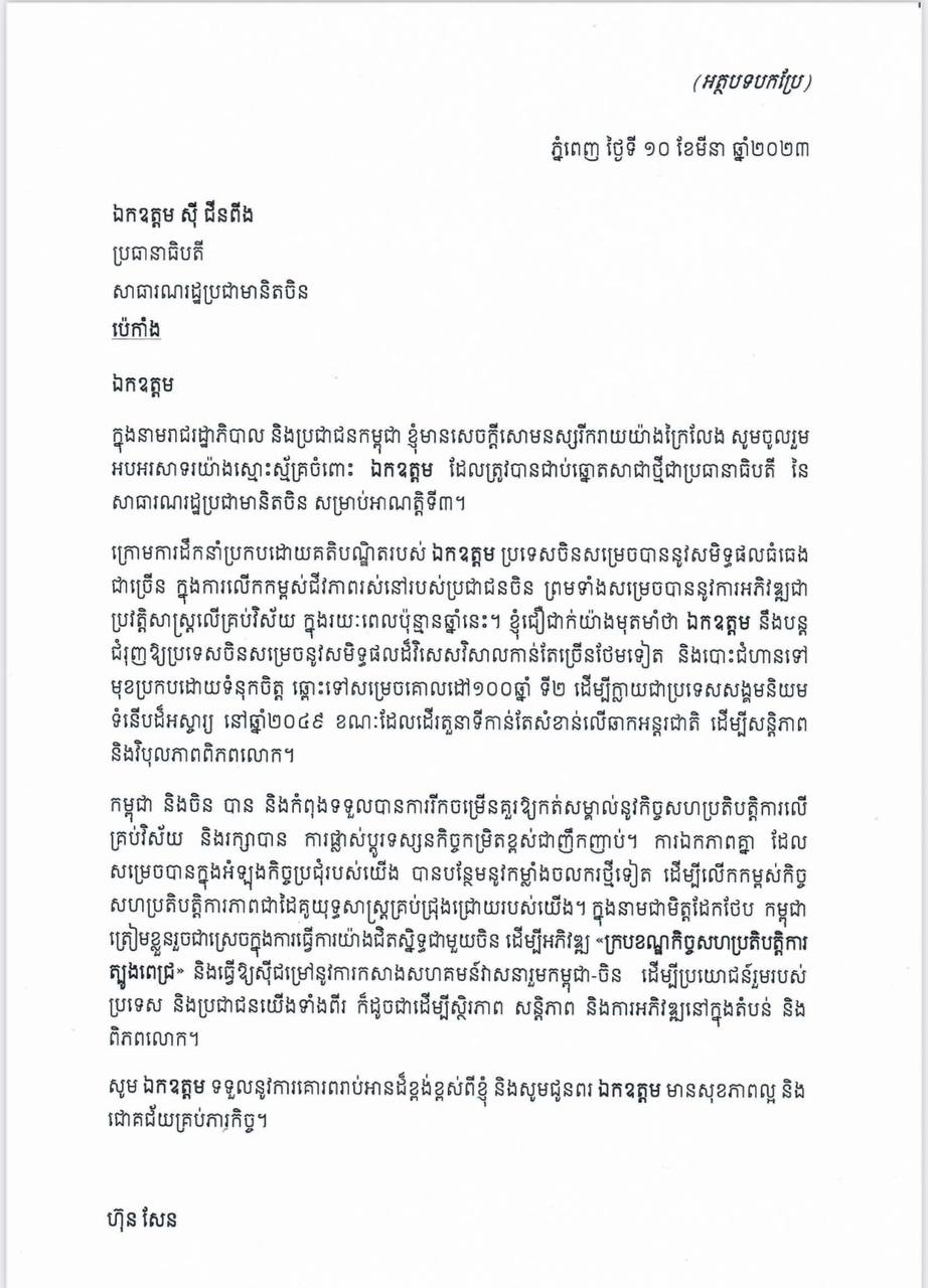 ក្នុងសារលិខិត សម្តេចតេជោ ហ៊ុន សែន បានលើកឡើងដូច្នេះថា៖ «ក្នុងនាមរាជរដ្ឋាភិបាល និងប្រជាជនកម្ពុជា ខ្ញុំមានសេចក្តីសោមនស្សរីករាយយ៉ាងក្រៃលែង សូមចូលរួម អបអរសាទរយ៉ាងស្មោះស្ម័គ្រចំពោះ ឯកឧត្តម ដែលត្រូវបានជាប់ឆ្នោតសាជាថ្មីជាប្រធានាធិបតីន សាធារណរដ្ឋប្រជាមានិតចិន សម្រាប់អាណត្តិទី៣។ ក្រោមការដឹកនាំប្រកបដោយគតិបណ្ឌិតរបស់ ឯកឧត្តម ប្រទេសចិនសម្រេចបាននូវសមិទ្ធផលធំធេង ជាច្រើន ក្នុងការលើកកម្ពស់ជីវភាពរស់នៅរបស់ប្រជាជនចិន ព្រមទាំងសម្រេចបាននូវការអភិវឌ្ឍជា ប្រវត្តិសាស្ត្រលើគ្រប់វិស័យ ក្នុងរយៈពេលប៉ុន្មានឆ្នាំនេះ។ »