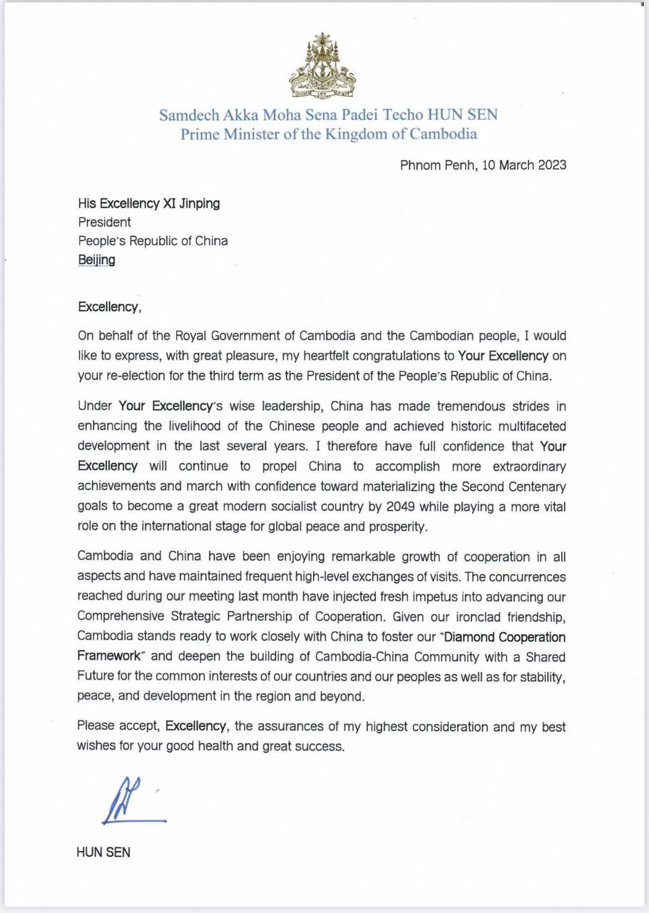 រាជធានីភ្នំពេញ៖ នៅថ្ងៃទី១១ ខែមីនា ឆ្នាំ២០២៣ សម្តេចតេជោ ហ៊ុន សែន នាយករដ្ឋមន្ត្រីនៃកម្ពុជា បានចូលរួមអបអរសាទរចំពោះ ឯកឧត្តម ស៊ី ជីនពីង ក្នុងឱកាសដែលជាប់ឆ្នោតសាជាថ្មីជាប្រធានាធិបតីចិន សម្រាប់អាណត្តិទី៣ ។