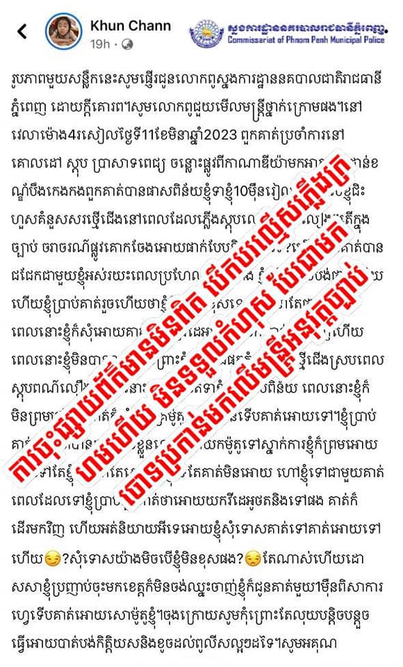 រាជធានីភ្នំពេញ៖ យោងតាមការចុះផ្សាយរបស់ ស្នងការដ្ឋាននគរបាលរាជធានីភ្នំពេញ នៅថ្ងៃទី១២ ខែមីនា ឆ្នាំ២០២៣ បានចេញសេចក្តីបកស្រាយបំភ្លឺ និងបដិសេធរបស់ក្រុមការងារព័ត៌មាន និងប្រតិកម្មរហ័សនៃស្នងការដ្ឋាននគរបាលរាជធានីភ្នំពេញ ទាក់ទងទៅនឹងការផុសរបស់គណនីហ្វេសបុកមួយឈ្មោះថា Khun chann ដែលបានចុះផ្សាយព័ត៌មានមិនពិត បើកបរល្មើសភ្លើងក្រហមហើយ មិនទទួលកំហុស បែរជាមកចោទប្រកាន់មកលើមន្ត្រីអនុវត្តច្បាប់។