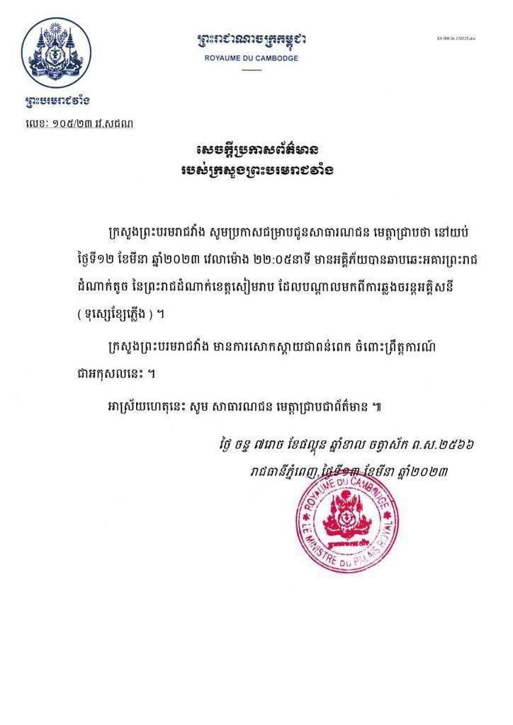 នៅក្នុងសេចក្ដីប្រកាសរបស់ ក្រសួងព្រះបរមរាជវាំង បានសូមជម្រាបជូនសាធារណជន មេត្តាជ្រាបថា នៅយប់ថ្ងៃទី១២ ខែមីនា ឆ្នាំ២០២៣ វេលាម៉ោង ២២៖០៥នាទី មានអគ្គិភ័យបានឆាបឆេះអគារព្រះរាជ ដំណាក់តូច នៃព្រះរាជដំណាក់ខេត្តសៀមរាប ដែលបណ្ដាលមកពីការឆ្លងចរន្តអគ្គិសនី (ទុស្សេខ្សែភ្លើង ) ។ ក្រសួងព្រះបរមរាជវាំង មានការសោកស្តាយជាពន់ពេក ចំពោះព្រឹត្តការណ៍ ជាអកុសលនេះ។ អាស្រ័យហេតុនេះ សូម សាធារណជន មេត្តាជ្រាបជាព័ត៌មាន ៕