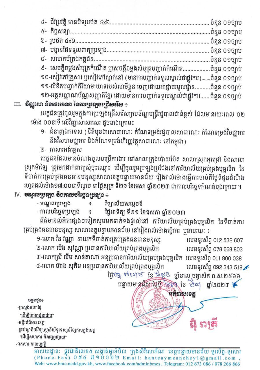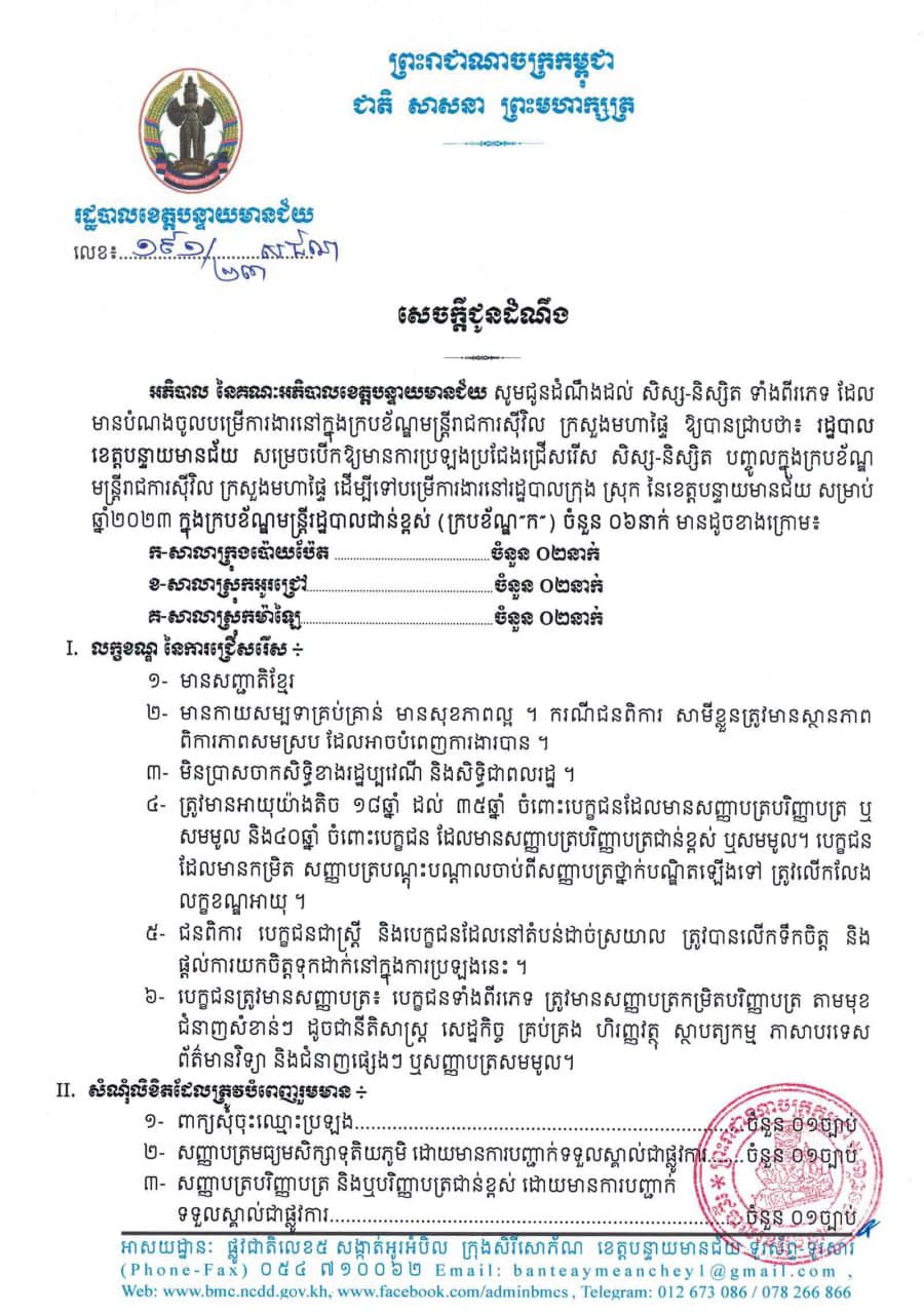 ខេត្តបន្ទាយមានជ័យ៖ យោងតាមការចុះផ្សាយរបស់ រដ្ឋបាល ខេត្តបន្ទាយមានជ័យ នៅថ្ងៃទី១៤ ខែមីនា ឆ្នាំ២០២៣ បានចេញសេចក្ដីជូនដំណឹងដល់ សិស្ស-និស្សិត ទាំងពីរភេទ ដែលមានបំណងចូលបម្រើការងារនៅក្នុងក្របខ័ណ្ឌមន្ត្រីរាជការវិល ក្រសួងមហាផ្ទៃ ឱ្យបានជ្រាបថា៖