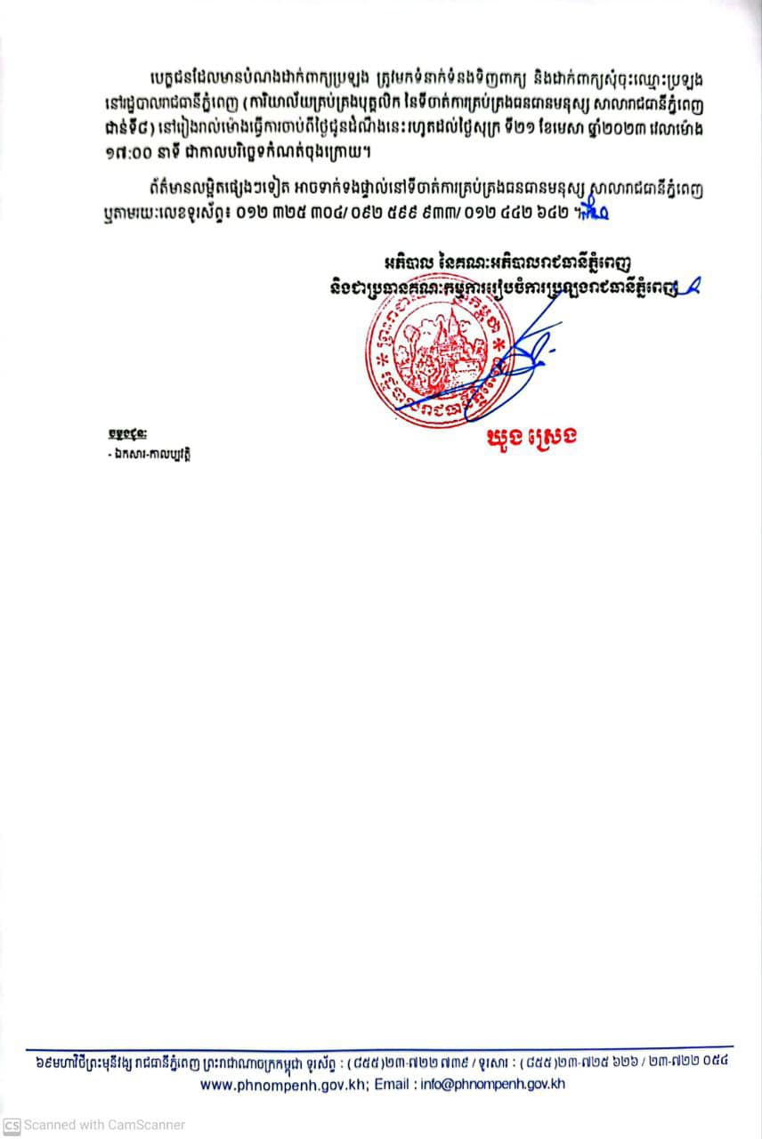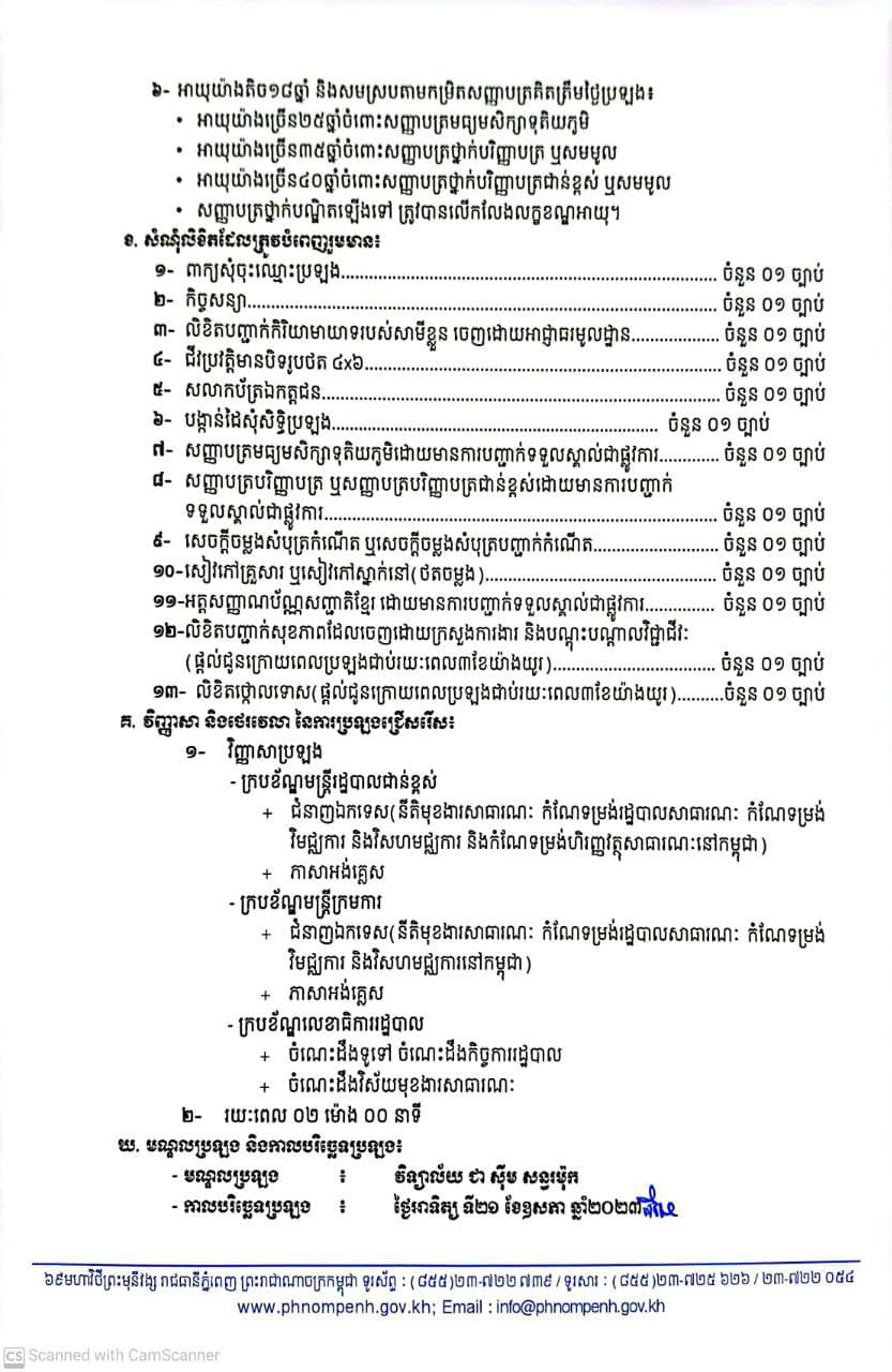 រដ្ឋបាលរាជធានីភ្នំពេញ សូមជូនដំណឹងដល់បេក្ខជនជាសិស្ស-និស្សិតទាំងពីរភេទ ដែលមានបំណងចង់ ចូលបម្រើការងារក្នុងក្របខ័ណ្ឌមន្ត្រីរាជការស៊ីវិល នៃរដ្ឋបាលរាជធានីភ្នំពេញ ឱ្យបានជ្រាបថា រដ្ឋបាលរាជធានីភ្នំពេញ នឹងរៀបចំឱ្យមានការប្រឡងជ្រើសរើសបេក្ខជនឱ្យចូលបម្រើការងារក្នុងក្របខ័ណ្ឌមន្ត្រីរាជការស៊ីវិល នៃរដ្ឋបាល រាជធានីភ្នំពេញសម្រាប់ឆ្នាំ២០២៣ ដូចខាងក្រោម៖