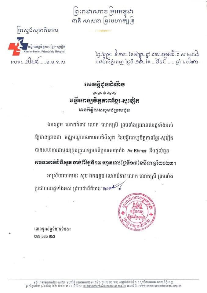 ក្នុងសេចក្ដីជូនដំណឹងរបស់មន្ទីរពេទ្យមិត្តភាពខ្មែរ-សូវៀត បានឱ្យដឹងថា មជ្ឈមណ្ឌលឯកទេសជំងឺសួត នៃមន្ទីរពេទ្យមិត្តភាពខ្មែរ-សូវៀត បានសហការជាមួយក្រុមគ្រូពេទ្យមកពីប្រទេសបារាំង Air Khmer នឹងផ្តល់ជូន ការវះកាត់ជំងឺសួត ចាប់ពីថ្ងៃទី១៣ រហូតដល់ថ្ងៃទី១៧ ខែមីនា ឆ្នាំ២០២៣។ អាស្រ័យហេតុនេះ សូម ឯកឧត្តម លោកជំទាវ លោក លោកស្រី ព្រមទាំង ប្រជាពលរដ្ឋទាំងអស់ ជ្រាបជាព័ត៌មាន ៕