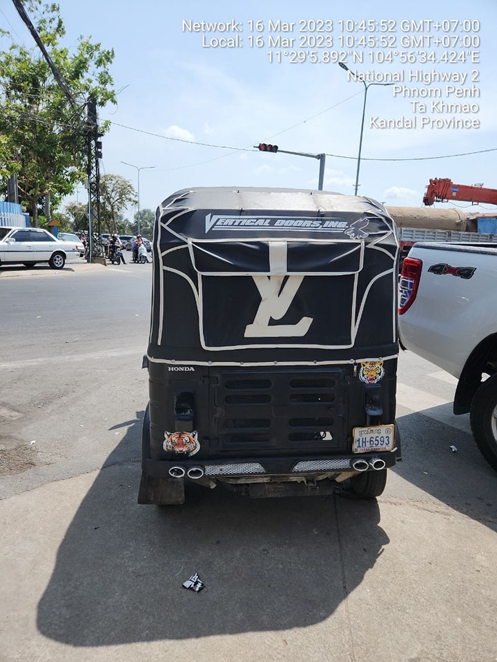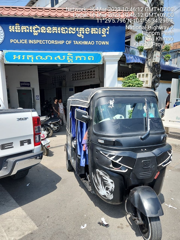 ស្នងការនៃស្នងការដ្ឋាននគរបាលខេត្តកណ្តាល ព្រឹកថ្ងៃទី១៦ ខែមីនា ឆ្នាំ២០២៣ កម្លាំងនៃអធិការដ្ឋានក្រុងតាខ្មៅឃាត់ម៉ូតូកង់បី PASSAPP កែច្នៃខុសលក្ខណៈបច្ចេកទេសមួយគ្រឿងម៉ាក BAJAJពណ៌លឿង ពាក់ផ្លាកលេខព្រះសីហនុ1H-6593 បើកបរដោយឈ្មោះ ស៊ា គឹមសេង ភេទប្រុសអាយុ ២៧ឆ្នាំ។ មានទីលំនៅភូមិព្រៃខ្លា ឃុំក្រោលគោ ស្រុកស្វាយរៀង ខេត្តស្វាយរៀង ក្នុងគោលបំណងដឹកកម្មករទៅធ្វើការនៅសង្កាត់រការខ្ពស់ ក្រុងតាខ្មៅ ខេត្តកណ្តាល ។