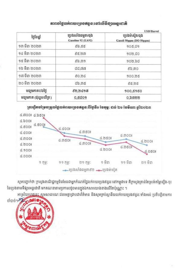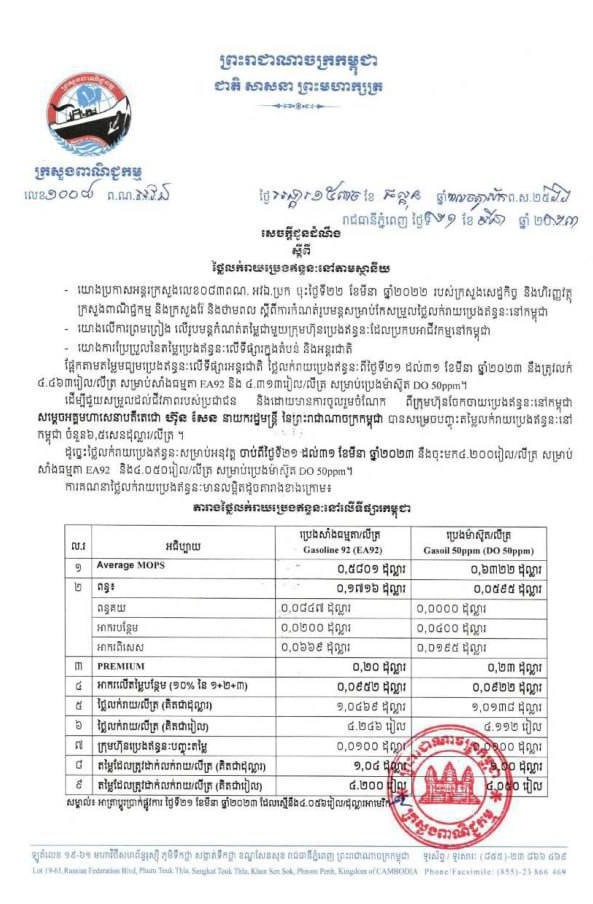 រាជធានីភ្នំពេញ៖ យោងតាមលិខិតរបស់ ក្រសួងពាណិជ្ជកម្ម ចុះផ្សាយថ្ងៃទី២១ ខែមីនា ឆ្នាំ២០២៣ ស្តីអំពីតម្លៃលក់រាយប្រេងឥន្ធនៈនៅតាមស្ថានីយទាំងអស់ក្នុងព្រះរាជាណាចក្រកម្ពុជាសម្រាប់អនុវត្តទៅតាមតម្លៃមធ្យមប្រេងឥន្ធនៈលើទីផ្សារអន្តរជាតិ ចាប់ពីថ្ងៃទី២១ ដល់ថ្ងៃទី៣១ ខែមីនា ឆ្នាំ២០២៣ បានឲ្យដឹងថា តម្លៃប្រេងសាំងធម្មតាមានតម្លៃ ៤,២០០រៀលក្នុងមួយលីត្រ ចំណែកឯប្រេងសាំងម៉ាស៊ូតមានតម្លៃ ៤,០៥០រៀលក្នុងមួយលីត្រប៉ុណ្ណោះ។