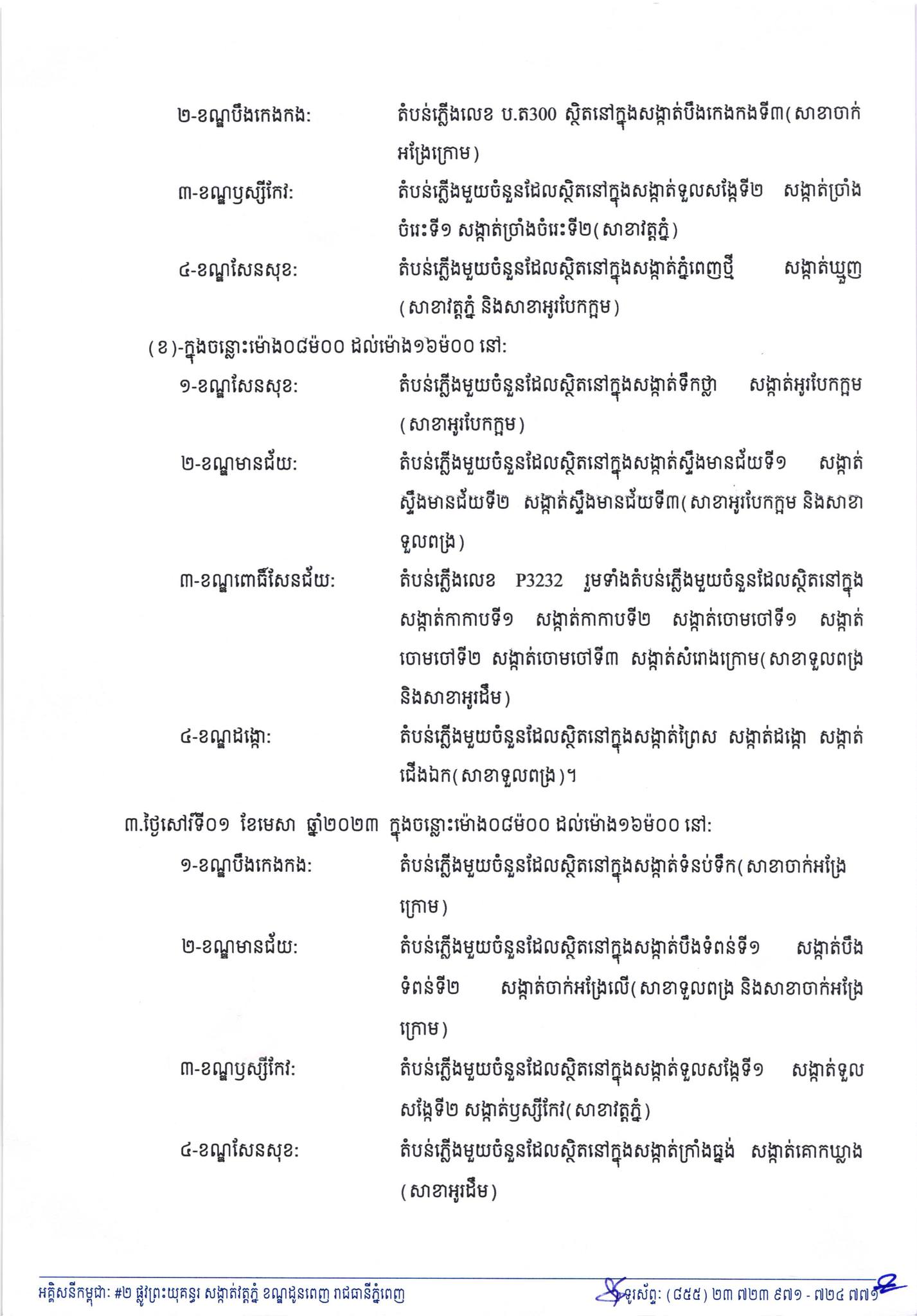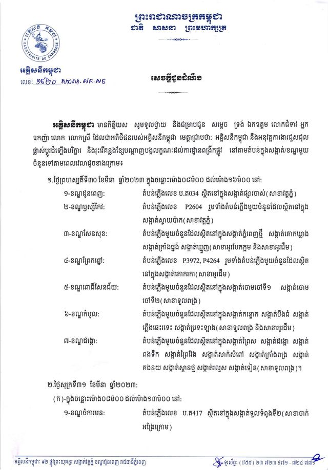 រាជធានីភំ្នពេញ៖ នៅថ្ងៃពុធ ៨កើត ខែចេត្រ ឆ្នាំខាល ចត្វាស័ក ព.ស.២៥៦៦ ត្រូវនឹងថ្ងៃទី២៩ ខែមីនា ឆ្នាំ២០២៣ យោងតាមការចុះផ្សាយរបស់ អគ្គិសនីកម្ពុជា បានចេញសេចក្តីជូនដំណឹងស្តីពីការអនុវត្តការងារជួសជុល ផ្លាស់ប្តូរ តម្លើងបរិក្ខារនានា និងរុះរើគន្លងខ្សែបណ្តាញអគ្គិសនីរបស់អគ្គិសនីកម្ពុជា ដើម្បីបង្កលក្ខណៈងាយស្រួលដល់ការដ្ឋានពង្រីកផ្លូវ នៅថ្ងៃទី៣០ ខែមីនា ឆ្នាំ២០២៣ ដល់ថ្ងៃទី០២ ខែមេសា ឆ្នាំ២០២៣ នៅតំបន់មួយចំនួនទៅតាមពេលវេលា និងទីកន្លែងដូចសេចក្តីជូនដំណឹងលម្អិតខាងក្រោម។