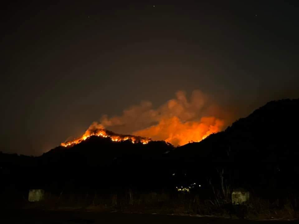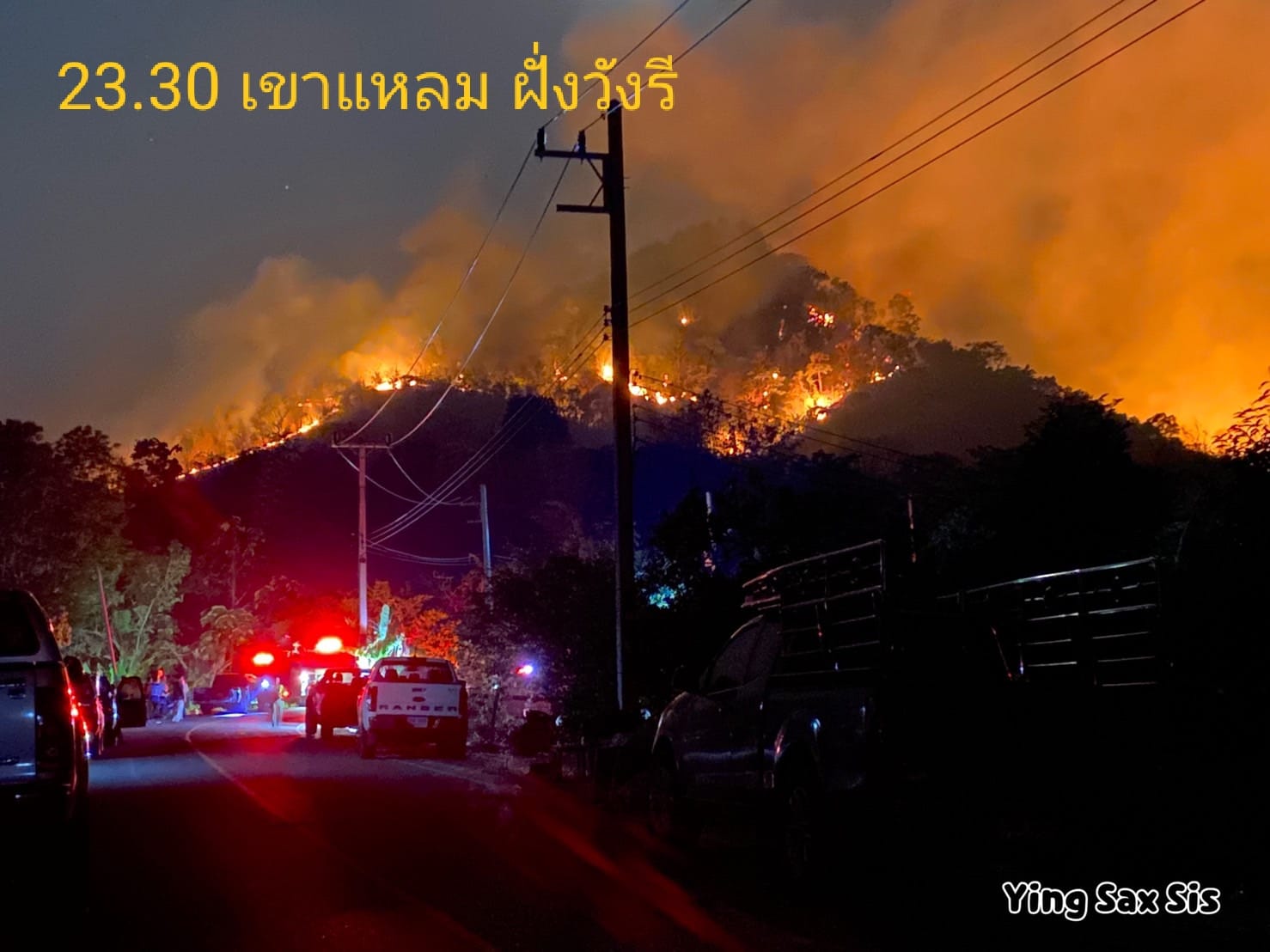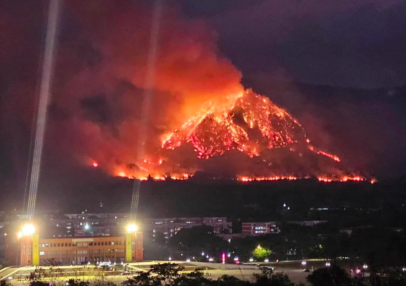 ភ្លើងឆេះព្រៃដែលបានចាប់ផ្តើមនៅលើភ្នំ Khao Chaplu ក្នុងខេត្ត Nakhon Nayok ភាគឦសានប្រទេសថៃកាលពីថ្ងៃអង្គារ បានរាលដាលដល់ផ្ទៃដីចំនួន ៧០០ រ៉ៃ ឬប្រមាណ ២៨០ អាក្រេ ទៅលើភ្នំជាច្រើនដូចជា៖ Khao Laem, Khao Kaew និង Khao Tabak។ ខ្យល់បក់ខ្លាំងបាននាំយកអណ្តាតភ្លើងទៅកាន់កំពូលភ្នំ Khao Laem កាលពីម្សិលមិញ ដែលមើលទៅដូចជាភ្នំភ្លើងផ្ទុះ នៅក្នុងរូបថតដែលថតពីខាងក្រោយសាលារាជបណ្ឌិត្យសភាយោធា Chulachomkhlao ក្នុងស្រុក Muang។