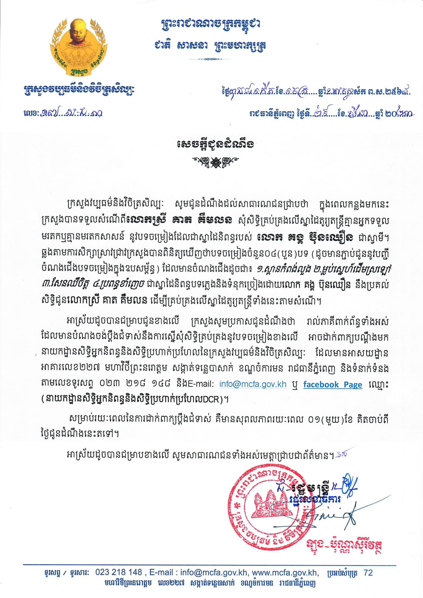 អាស្រ័យដូចបានជម្រាបជូនខាងលើ ក្រសួងសូមប្រកាសជូនដំណឹងថា រាល់ភាគីពាក់ព័ន្ធទាំងអស់ ដែលមានបំណងចង់ប្តឹងជំទាស់នឹងការស្នើសុំសិទ្ធិគ្រប់គ្រងនូវបទចម្រៀងខាងលើ អាចដាក់ពាក្យបណ្តឹងមក នាយកដ្ឋានសិទ្ធិអ្នកនិពន្ធនិងសិទ្ធិប្រហាក់ប្រហែលនៃក្រសួងវប្បធម៌និងវិចិត្រសិល្បៈ ដែលមានអាសយដ្ឋាន អាគារលេខ២២៧ មហាវិថីព្រះនរោត្តម សង្កាត់ទន្លេបាសាក់ ខណ្ឌចំការមន រាជធានីភ្នំពេញ និងទំនាក់ទំនង តាមលេខទូរសព្ទ ០២៣ ២១៨ ១៤៨ និងE-mail: info@mcfa.gov.kh | facebook Page ឈ្មោះ (នាយកដ្ឋានសិទ្ធិអ្នកនិពន្ធនិងសិទ្ធិប្រហាក់ប្រហែលDCR)។