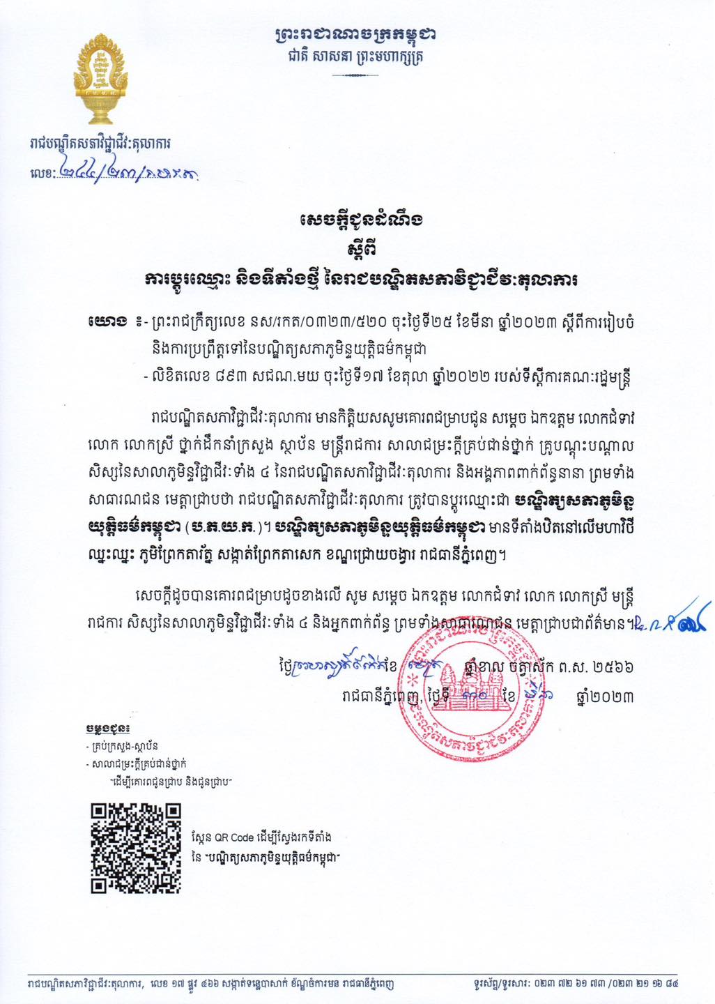 យោងតាមសេចក្តីជូនដំណឹង បានឱ្យដឹងថា «រាជបណ្ឌិតសភាវិជ្ជាជីវៈតុលាការ មានកិត្តិយសសូមគោរពជម្រាបជូន សម្តេច ឯកឧត្តម លោកជំទាវ លោក លោកស្រី ថ្នាក់ដឹកនាំក្រសួង ស្ថាប័ន មន្ត្រីរាជការ សាលាជម្រះក្តីគ្រប់ជាន់ថ្នាក់ គ្រូបណ្តុះបណ្តាល សិស្សនៃសាលាភូមិន្ទវិជ្ជាជីវៈទាំង ៤ នៃរាជបណ្ឌិតសភាវិជ្ជាជីវៈតុលាការ និងអង្គភាពពាក់ព័ន្ធនានា ព្រមទាំង សាធារណជន មេត្តាជ្រាបថា រាជបណ្ឌិតសភាវិជ្ជាជីវៈតុលាការ ត្រូវបានប្តូរឈ្មោះជា បណ្ឌិត្យសភាភូមិន្ទ យុត្តិធម៌កម្ពុជា (ប.ក.យ.ក.)។ បណ្ឌិត្យសភាភូមិន្ទយុត្តិធម៌កម្ពុជា មានទីតាំងឋិតនៅលើមហាវិថី ឈ្នះឈ្នះ ភូមិព្រែកតារ័ត្ន សង្កាត់ព្រែកតាសេក ខណ្ឌជ្រោយចង្វារ រាជធានីភ្នំពេញ»៕