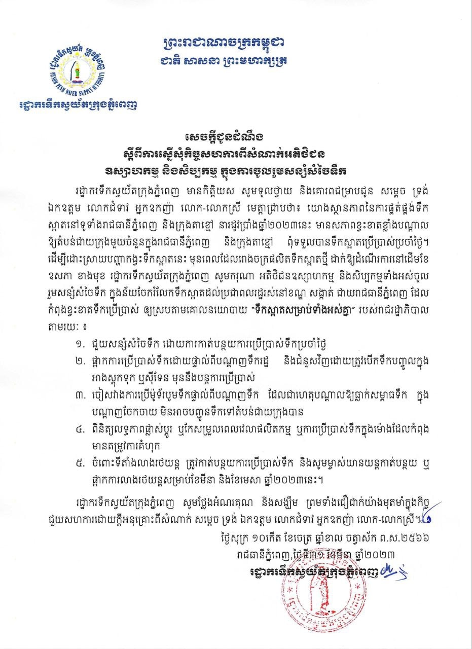 រាជធានីភ្នំពេញ៖ យោងតាមការចុះផ្សាយរបស់ រដ្ឋាករទឹកស្វយ័តក្រុងភ្នំពេញ បានចេញសេចក្ដីជូនដំណឹង ស្តីពីការស្នើសុំកិច្ចសហការពីសំណាក់អតិថិជន ឧស្សាហកម្ម និងសិប្បកម្ម ក្នុងការចូលរួមសន្សំសំចៃទឹក។