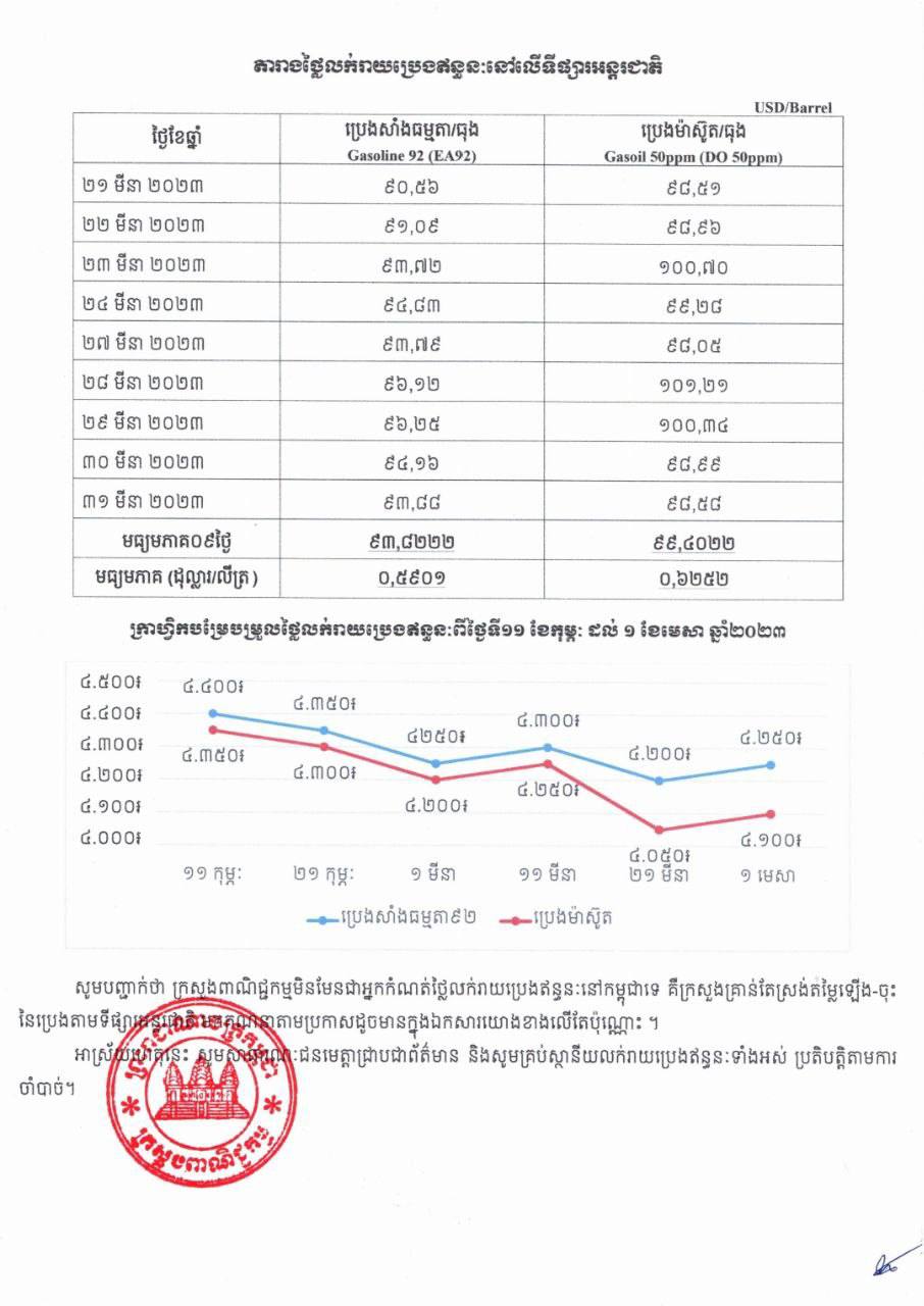 រាជធានីភ្នំពេញ៖ យោងតាមលិខិតរបស់ ក្រសួងពាណិជ្ជកម្ម ចុះផ្សាយថ្ងៃទី០១ ខែមេសា ឆ្នាំ២០២៣ ស្តីអំពីតម្លៃលក់រាយប្រេងឥន្ធនៈនៅតាមស្ថានីយទាំងអស់ក្នុងព្រះរាជាណាចក្រកម្ពុជាសម្រាប់អនុវត្តទៅតាមតម្លៃមធ្យមប្រេងឥន្ធនៈលើទីផ្សារអន្តរជាតិ ចាប់ពីថ្ងៃទី០១ ដល់ថ្ងៃទី១០ ខែមេសា ឆ្នាំ២០២៣ បានឲ្យដឹងថា តម្លៃប្រេងសាំងធម្មតាមានតម្លៃ ៤,២៥០រៀលក្នុងមួយលីត្រ ចំណែកឯប្រេងសាំងម៉ាស៊ូតមានតម្លៃ ៤,១០០រៀលក្នុងមួយលីត្រប៉ុណ្ណោះ។