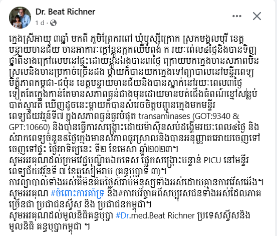 នៅក្នុងគណនីហ្វេសប៊ុកខាងលើ បានឱ្យដឹងថា​៖ « ក្មេងស្រីអាយុ ៣ឆ្នាំ មកពីភូមិព្រែករពៅ ឃុំឬស្សីក្រោក ស្រុកមង្គលបុរី ខេត្តបន្ទាយមានជ័យ មានអាការៈក្តៅខ្លួនក្អកឈឺបំពង់ ក រយៈពេល៤ថ្ងៃនិងបានទិញថ្នាំពីខាងក្រៅលេបនៅផ្ទះដោយខ្លួនឯងបាន៣ថ្ងៃ ក្រោយមកក្មេងមានសភាពមិនស្រួលនិងមានប្រកាច់ច្រើនដង ម្តាយក៏បានយកក្មេងទៅព្យាបាលនៅមន្ទីរពេទ្យមិត្តភាពកម្ពុជា-ជប៉ុន ខេត្តបន្ទាយមានជ័យ និងបានស្នាក់នៅរយៈពេល៣ថ្ងៃទៀតតែក្មេងកាន់តែមានសភាពធ្ងន់ជាងមុនដោយមានបត់ជើងធំពណ៌ខ្មៅសន្លប់បាត់ស្មារតី ឃើញដូចនេះម្តាយក៏បានសំរេចចិត្តបញ្ជូនក្មេងមកមន្ទីរពេទ្យជ័យវរ្មន៍ទី៧ ក្នុងសភាពធ្ងន់ធ្ងរបំផុត transaminases (GOT:9340 & GPT:10660) និងបានធ្វើការសង្គ្រោះដោយម៉ាស៊ីនសប់ដង្ហើមរយៈពេល៤ថ្ងៃ និងសំរាកពេទ្យចំនួន៩ថ្ងៃ ក្មេងមានសភាពធូរស្រាលនិងបានអនុញ្ញាតអោយចេញទៅចេញទៅផ្ទះ ថ្ងៃអាទិត្យនេះ ទី០២ ខែមេសា ឆ្នាំ២០២៣។»