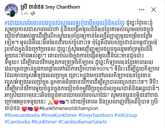 នៅក្នុងគណនីហ្វេសប៊ុកផេករបស់ ឧកញ៉ា ស្រី ចាន់ថន បានសរសេរយ៉ាងដូច្នេះថា៖ « ដោយសារតែមានបងប្អូនសំណូមពរឲ្យខ្ញុំបង្កើតមូលនិធិគុនខ្មែរ ដូច្នេះថ្ងៃនេះខ្ញុំសូមប្រកាសជាសាធារណថា ខ្ញុំនឹងបង្កើតមូលនិធិគុនខ្មែរតាមសំណូមពរបងប្អូនយើងទាំងអស់គ្នាដើម្បីលើកស្ទួយគុនខ្មែរឲ្យកាន់តែល្បីល្បាញមួយកម្រិតបន្ថែមទៀត។ មូលនិធិនេះមិនមែនជារបស់ខ្ញុំនោះទេ ប៉ុន្តែគឺជារបស់ប្រជាជនកម្ពុជាគ្រប់រូបទាំងក្នុងនិងក្រៅប្រទេស ដូច្នេះខ្ញុំសូមអញ្ជើញឲ្យបងប្អូនចូលរួមគាំទ្រមូលនិធិមួយនេះទាំងអស់គ្នា។ »