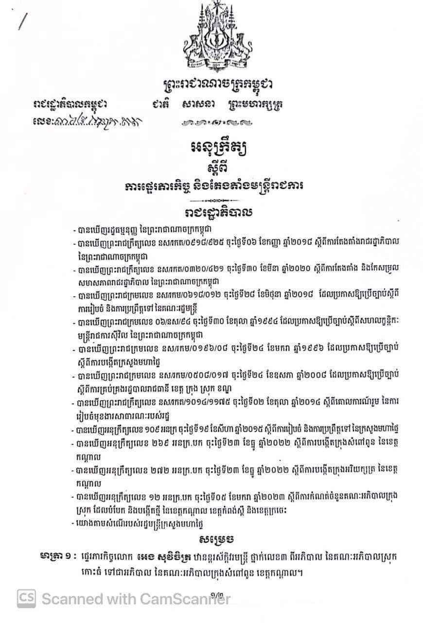 មាត្រា១៖ ប្រមុខរាជរដ្ឋាភិបាលកម្ពុជា សម្រេចផ្ទេរភារកិច្ចលោក អេង សុវិចិត្រ ឋានន្តរស័ក្តិវរមន្ត្រី ថ្នាក់លេខ៣ ពីអភិបាល នៃគណៈអភិបាលស្រុក កោះធំ ទៅជាអភិបាល នៃគណៈអភិបាលក្រុងសំពៅពូន ខេត្តកណ្តាល។