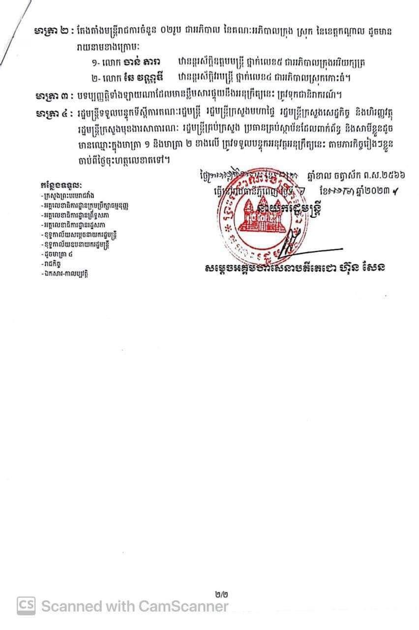 មាត្រា២៖ តែងតាំងមន្ត្រីរាជការចំនួន ០២រូប ជាអភិបាល នៃគណៈអភិបាលក្រុង ស្រុក នៃខេត្តកណ្តាល ដូចមានរាយនាមខាងក្រោម៖