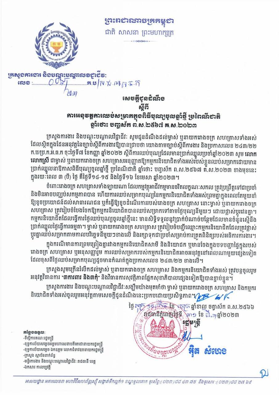 សូម លោក លោកស្រី ជាម្ចាស់ ឬនាយករោងចក្រ សហគ្រាសអនុញ្ញាតឱ្យកម្មករនិយោជិតទាំងអស់របស់ខ្លួនឈប់សម្រាកដោយមាន ប្រាក់ឈ្នួលនាឱកាសពិធីបុណ្យចូលឆ្នាំថ្មី ប្រពៃណីជាតិ ឆ្នាំថោះ បញ្ចស័ក ព.ស.២៥៦៧ គ.ស.២០២៣ ខាងមុខនេះ ក្នុងរយៈពេល ៣ (បី) ថ្ងៃ គឺថ្ងៃទី១៤-១៥ និងថ្ងៃទី១៦ ខែមេសា ឆ្នាំ២០២៣។