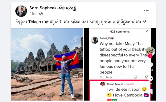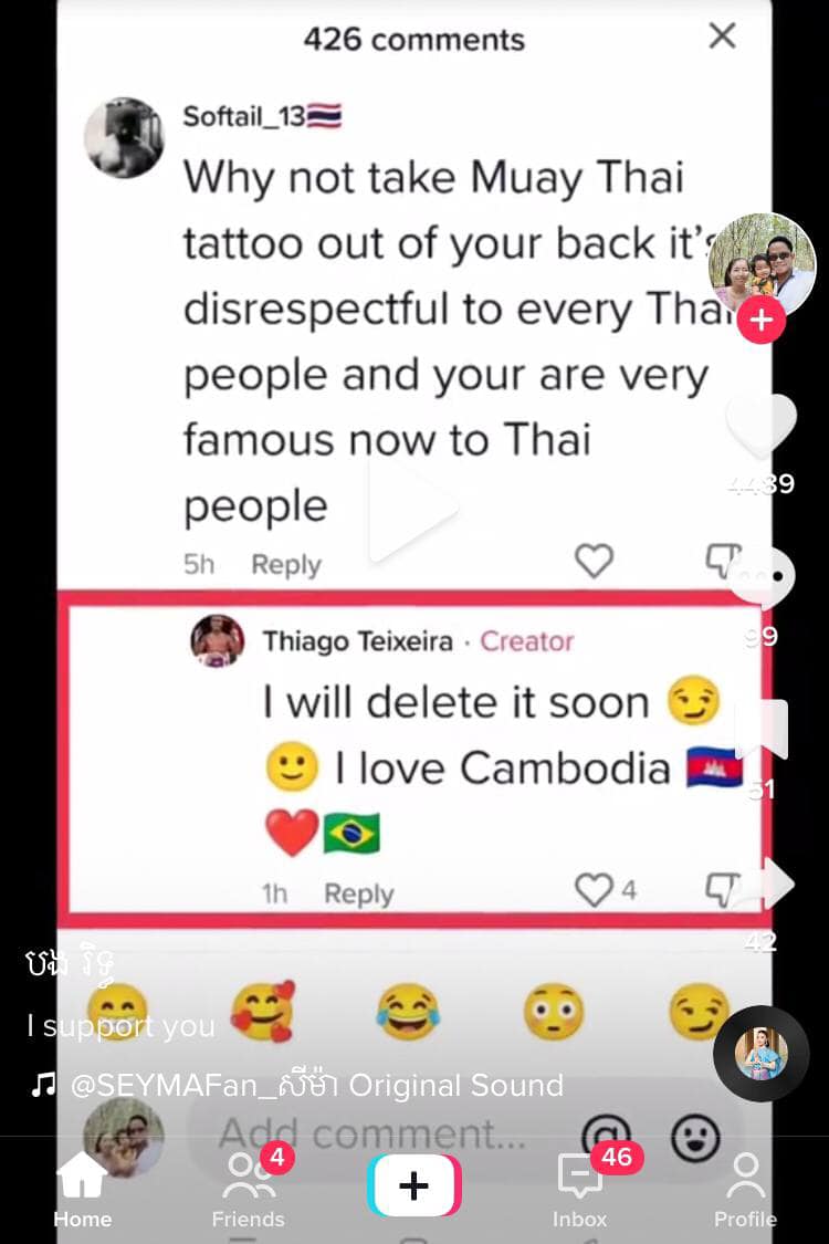កីឡាករប្រដាល់ប្រេស៊ីល Thiago Teixeira បានបញ្ជាក់បែបនោះ គឺដោយសារមានអ្នកលេងបណ្ដាញសង្គមថៃម្នាក់ បានចោទសួរថា៖«ហេតុអ្វីបានជាមិនលុបសាក់ Muay Thai ចេញពីខ្នងរបស់អ្នក? វាជាការមិនគោរពដល់ប្រជាជនថៃគ្រប់គ្នា ហើយអ្នកពេលនេះ គឺល្បីខ្លាំងណាស់នៅស្រុកថៃ»។ លោក Thiago Teixeira ក៏បានតបទៅវិញថា៖«ខ្ញុំនឹងលុបវាចេញឆាប់ៗនេះ ខ្ញុំស្រឡាញ់ប្រទេសកម្ពុជា»៕