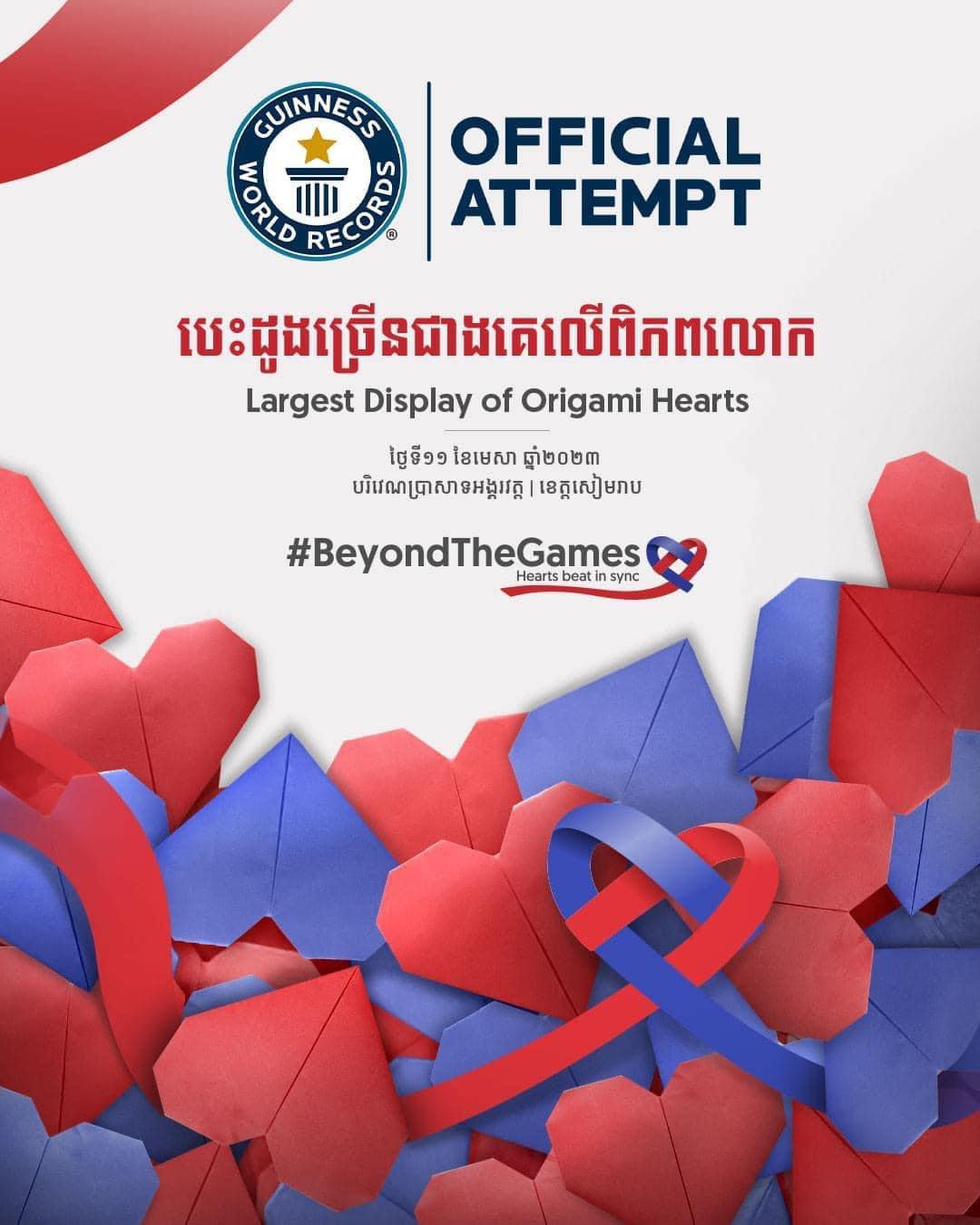 បេះដូងដែលបងប្អូនបានបត់ដោយផ្ទាល់ដៃនឹងចេញពីទំហំទឹកចិត្ត និងក្ដីស្រលាញ់ ដើម្បីគាំទ្រដល់អត្តពលិកដែលមានពិការភាពនោះ នឹងរាប់សម្រាប់បំបែកឯតទគ្គកម្ម «បេះដូងច្រើនជាងគេលើពិភពលោក» នាថ្ងៃទី១១ ខែមេសា ឆ្នាំ២០២៣ វេលាម៉ោង ៤រសៀលតទៅ នៅបរិវេណប្រាសាទអង្គរវត្ត។