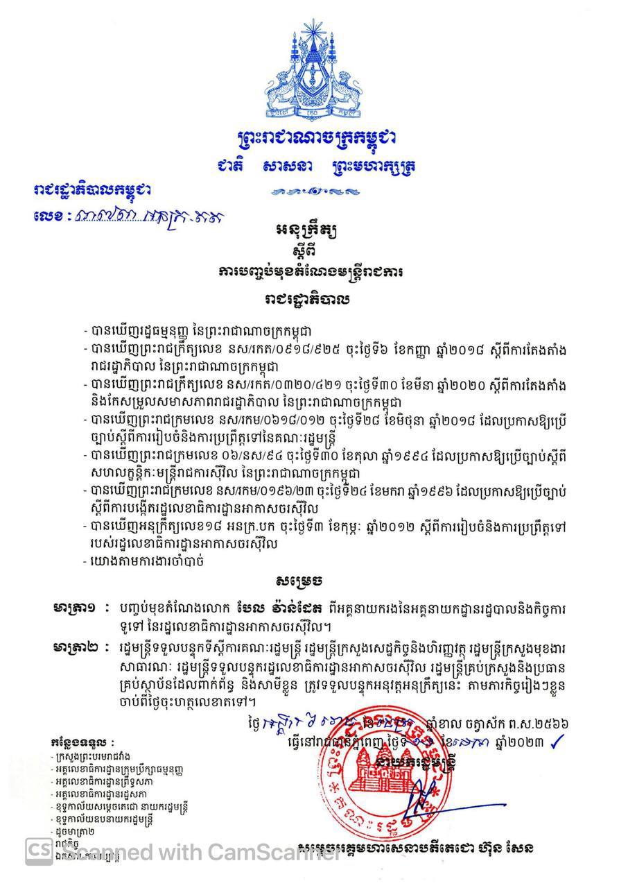 រាជរដ្ឋាភិបាលកម្ពុជា សម្រេចបញ្ចប់មុខតំណែងលោក បែល វ៉ន់ដោត ពីអគ្គនាយករងនៃអគ្គនាយកដ្ឋានរដ្ឋបាលនិងកិច្ចការ ទូទៅ នៃរដ្ឋលេខាធិការដ្ឋានអាកាសចរស៊ីវិល។