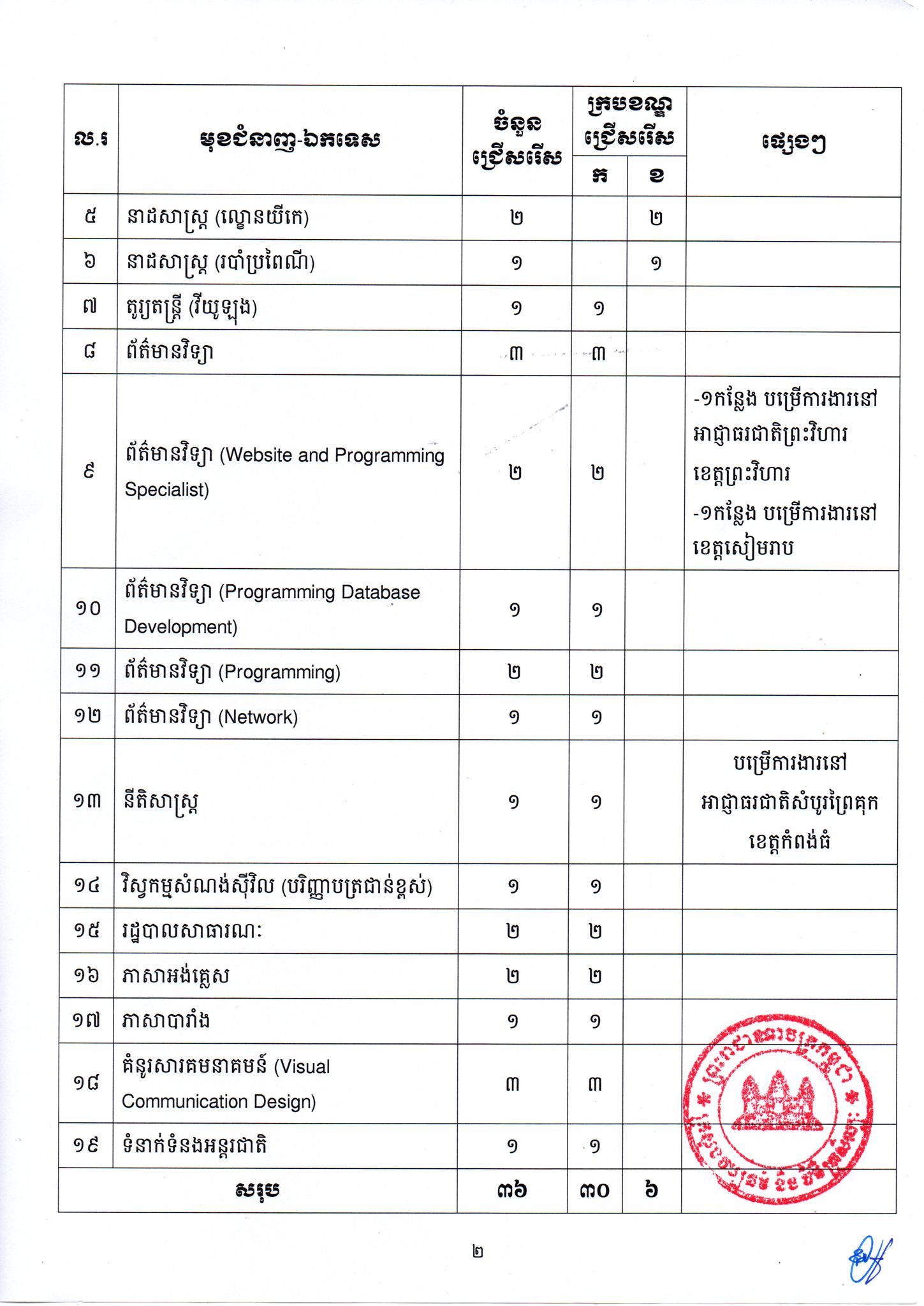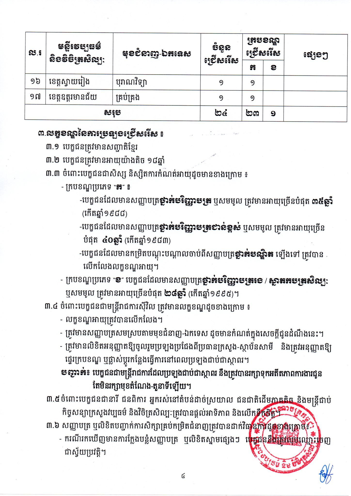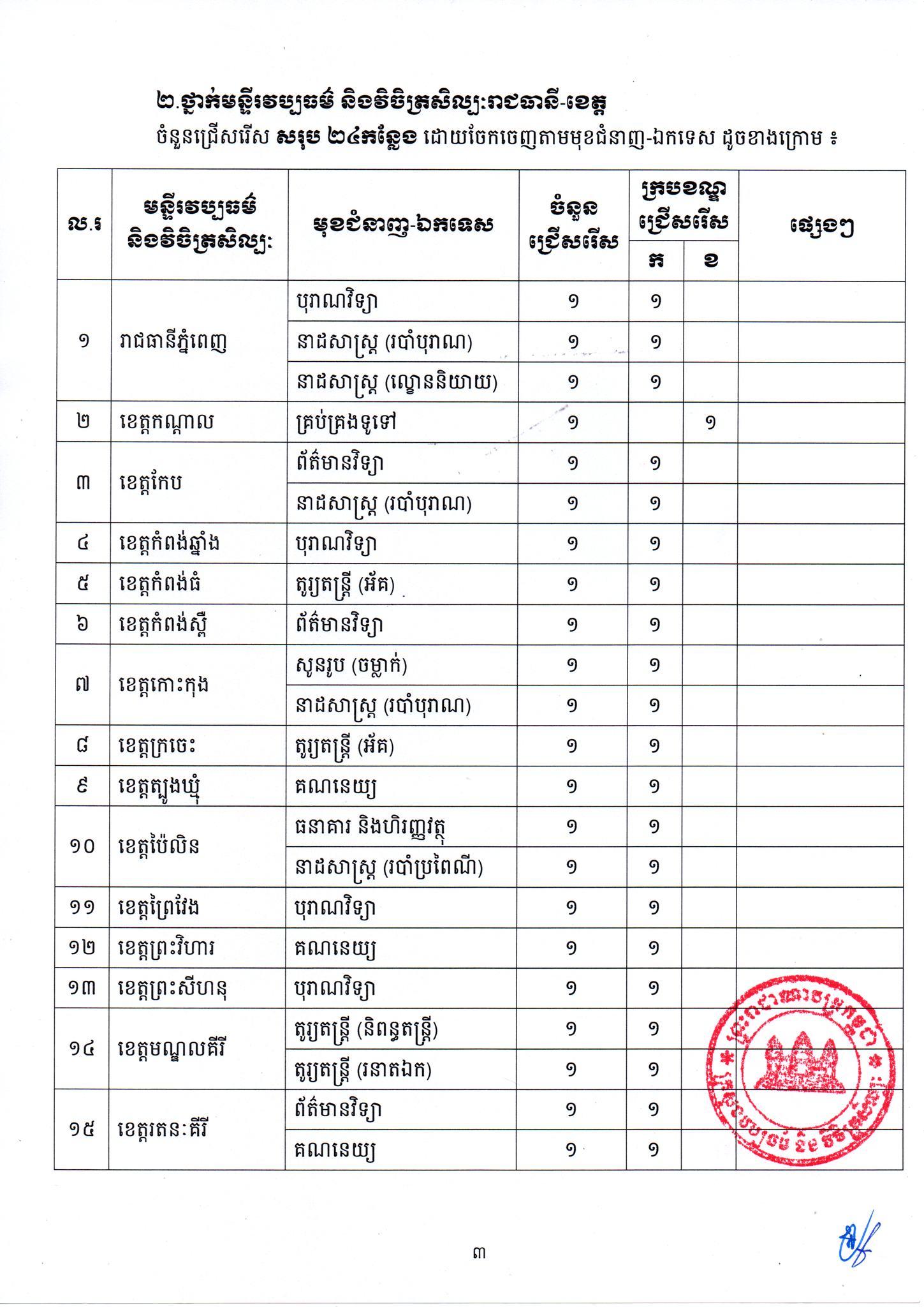 ក្រសួងវប្បធម៌ និងវិចិត្រសិល្បៈ នឹងរៀបចំការប្រឡងជ្រើសរើសបេក្ខជនឱ្យចូលបម្រើការងារក្នុងក្របខ័ណ្ឌ តាមចំនួន និងលក្ខខណ្ឌដូចខាងក្រោម៖