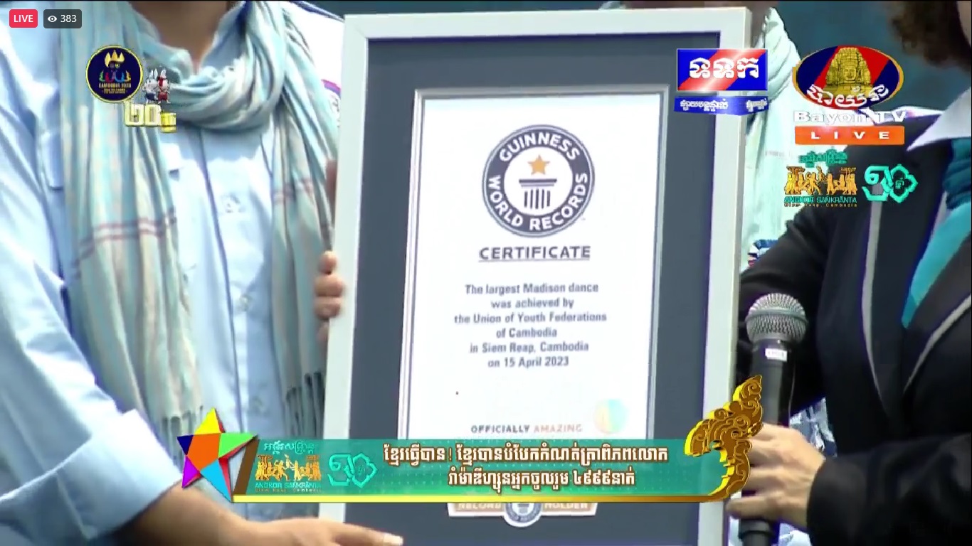 ខេត្តសៀមរាប៖ យោងតាមចុះផ្សាយរបស់ នាយកដ្ឋានព័ត៌មាន បានឱ្យដឹងថា កម្ពុជាបានបំបែកឯតទគ្គកម្មពិភពលោកសារជាថ្មី «រាំម៉ាឌីហ្សុនច្រើនជាងគេ» ដែលមានអ្នកចូលរួមរាំច្រើនជាងគេ ដោយជោគជ័យជាថ្មីម្ដងទៀត ដោយមានចំនួនអ្នកចូលរួម រាំសរុប ៤៩៩៩ នាក់ នៅម៉ោង ១០:៣៦ នាទីព្រឹក ថ្ងៃទី១៥ ខែមេសា ឆ្នាំ២០២៣ ក្នុងព្រឹត្តិការណ៍អង្គរសង្រ្កាន្ដ ឆ្នាំ២០២៣ នៅទីតាំងព្រះលានជល់ដំរី។