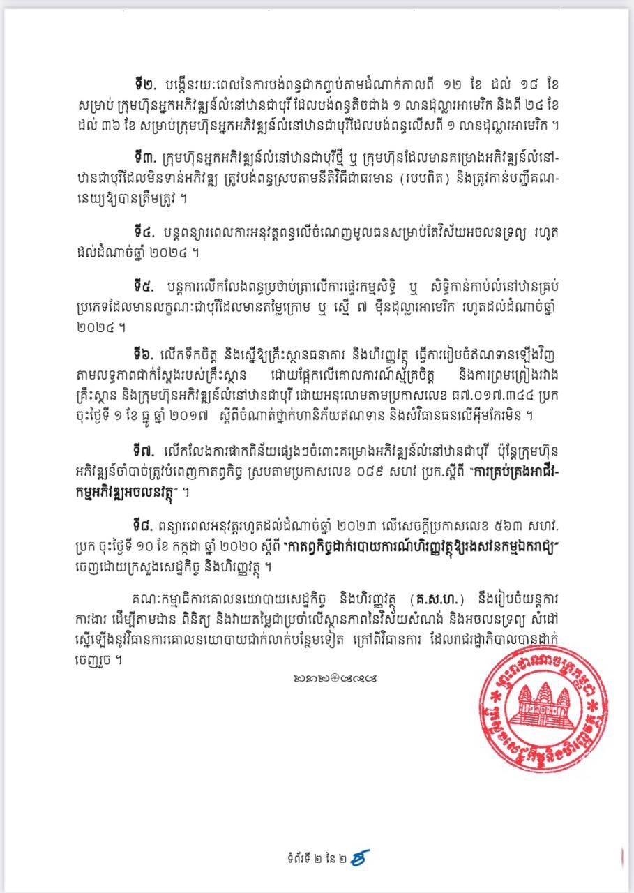 ក្នុងន័យនេះ ដើម្បីរក្សាស្ថិរភាពនៃវិស័យសំណង់ និងអចលនទ្រព្យ ដែលត្រូវបានចាត់ទុកជាវិស័យ អាទិភាពមួយក្នុងការគាំទ្រដល់កំណើនសេដ្ឋកិច្ចជារួម, ជាពិសេស បន្តរក្សានិរន្តរភាពការងារជូនបងប្អូនកម្មករ ព្រមទាំងលើកកម្ពស់លទ្ធភាពដល់ប្រជាពលរដ្ឋដែលមានចំណូលទាប និងមធ្យម អាចមានលទ្ធភាពទិញ លំនៅឋានតម្លៃសមរម្យបាន, រាជរដ្ឋាភិបាលបានសម្រេចដាក់ចេញនូវវិធានការបន្ថែម ជាកញ្ចប់ ដូចខាងក្រោម៖