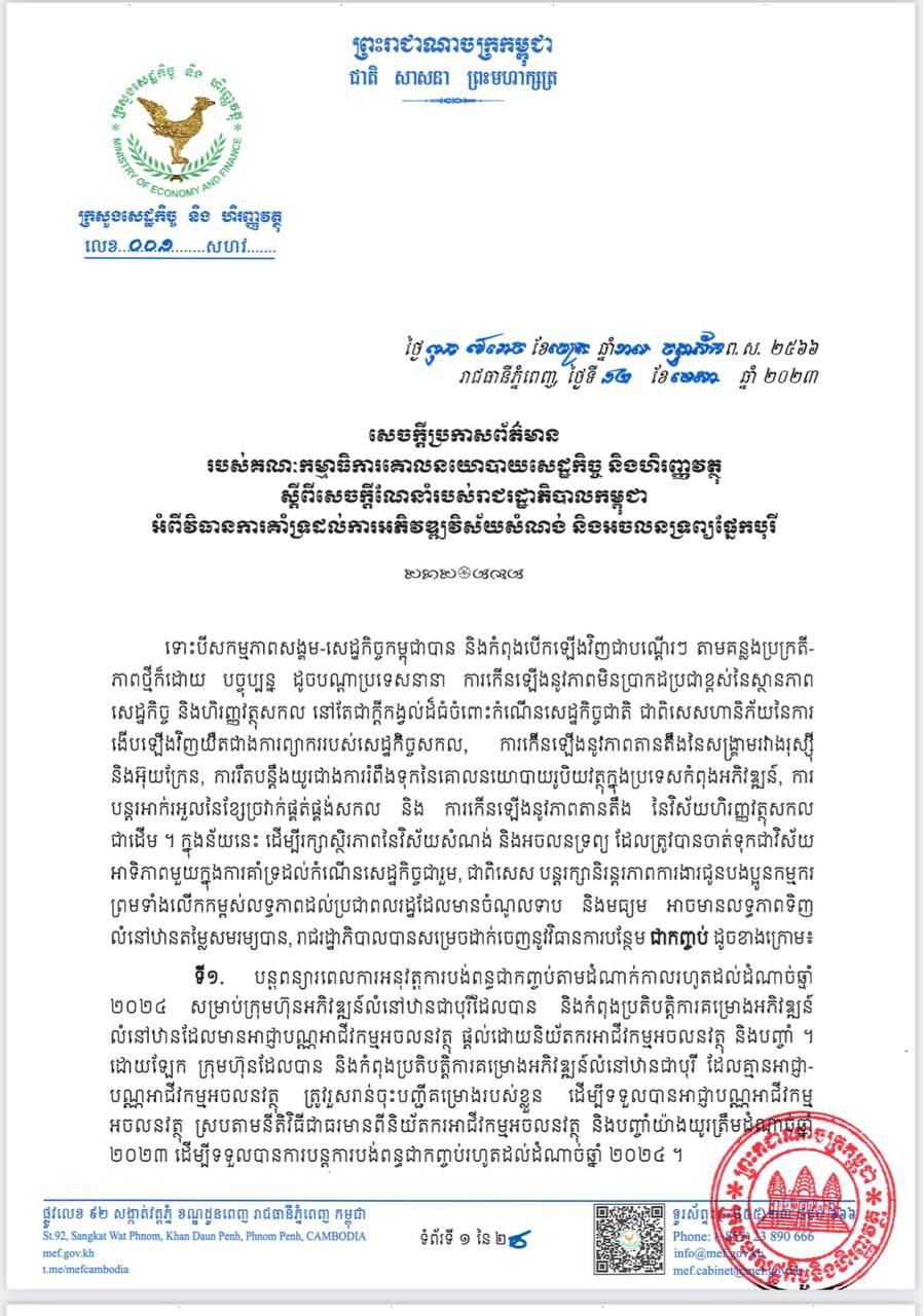 រាជធានីភ្នំពេញ៖ នៅថ្ងៃទី១៧ ខែមេសា ឆ្នាំ២០២៣ យោងតាមការចុះផ្សាយរបស់ ក្រសួងសេដ្ឋកិច្ច និងហិរញ្ញវត្ថុ បានសេចក្តីប្រកាសព័ត៌មាន របស់គណៈកម្មាធិការគោលនយោបាយសេដ្ឋកិច្ចនិងហិរញ្ញវត្ថុ ស្តីពីសេចក្តីណែនាំរបស់រាជរដ្ឋាភិបាលកម្ពុជា អំពីវិធានការគាំទ្រដល់ការអភិវឌ្ឍវិស័យសំណង់ និងអចលនទ្រព្យផ្នែកបុរី។