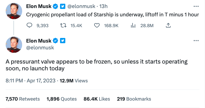 នៅលើបណ្ដាញសង្គម Twitter លោក Elon Musk បានសរសេរថា៖«Pressurant Valves (ប្រព័ន្ធជំរុញយានអវកាស) ត្រូវ​បាន​កក ដូច្នេះ​វា​នឹងចាប់​ផ្តើម​ដំណើរ​ការ​ក្នុង​ពេល​ឆាប់​ៗ​នេះ មិន​អាចមាន​ការ​បង្ហោះ​នៅ​ថ្ងៃ​នេះ​ទេ»។ ជម្រាបដែរថា ការប៉ុនប៉ងបាញ់បង្ហោះលើកក្រោយទៀត នឹងធ្វើឡើងយ៉ាងហោចណាស់ ៤៨ ម៉ោង បន្ទាប់ពីនោះ៕