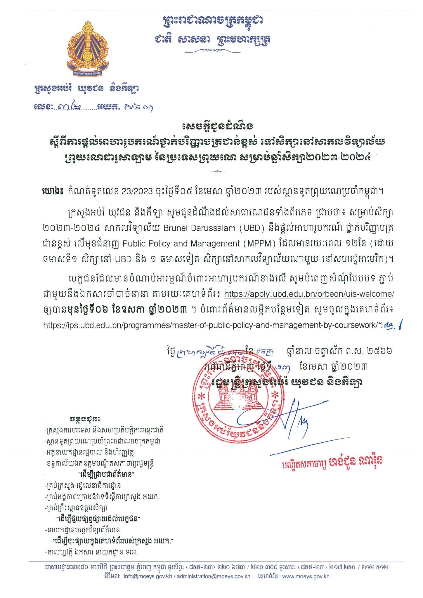 រាជធានីភ្នំពេញ៖ នៅថ្ងៃទី១៨ ខែមេសា ឆ្នាំ២០២៣ យោងតាមការចុះផ្សាយរបស់ ក្រសួងអប់រំ យុវជន និងកីឡា បានចេញសេចក្ដីជូនដំណឹង ស្ដីពីអាហារូបករណ៍ថ្នាក់បរិញ្ញាបត្រជាន់ខ្ពស់ សិក្សានៅសាកលវិទ្យាល័យប្រ៊ុយណេដារូសាឡាម នៃប្រទេសប្រ៊ុយណេ សម្រាប់ឆ្នាំសិក្សា២០២៣-២០២៤។