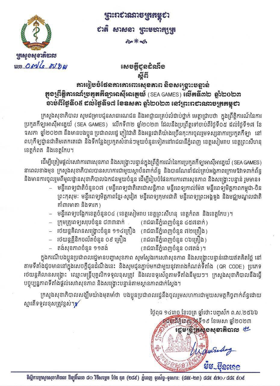 ក្រសួងសុខាភិបាល សូមជម្រាបជូនសាធារណជន និងអាជ្ញាធរគ្រប់លំដាប់ថ្នាក់ មេត្តាជ្រាបថា ក្នុងព្រឹត្តិការណ៍នៃការ ប្រកួតកីឡាអាស៊ីអាគ្នេយ៍ (SEA GAMES) លើកទី៣២ ឆ្នាំ២០២៣ ដែលនឹងប្រព្រឹត្តទៅចាប់ពីថ្ងៃទី០៥ ដល់ថ្ងៃទី១៧ ខែឧសភា ឆ្នាំ២០២៣ នឹងមានបងប្អូន ប្រជាពលរដ្ឋ ភ្ញៀវជាតិ និងអន្តរជាតិយ៉ាងច្រើនកុះករចូលរួមទស្សនាការប្រកួតកីឡា នៅពហុកីឡដ្ឋានជាតិមរតកតេជោ និងទីកន្លែងប្រកួតសំខាន់ៗមួយចំនួនទៀតនៅរាជធានីភ្នំពេញ ខេត្តសៀមរាប ខេត្តព្រះសីហនុ ខេត្តកំពត និងខេត្តកែប។