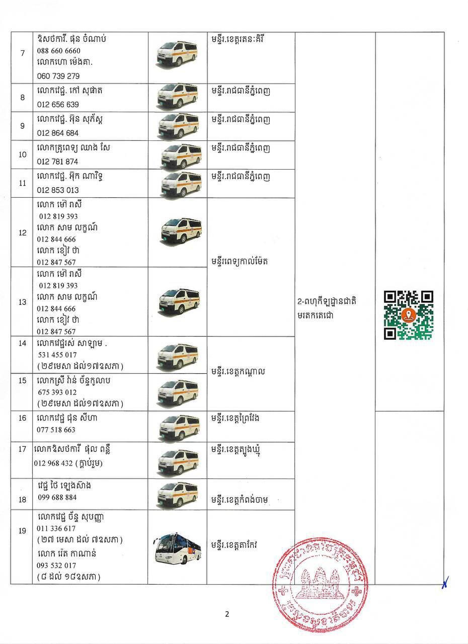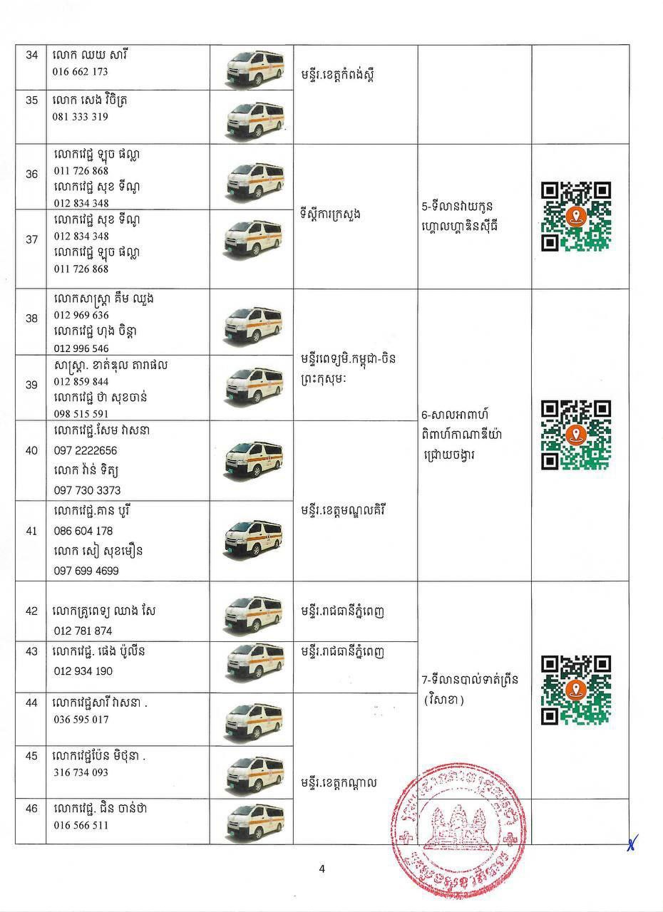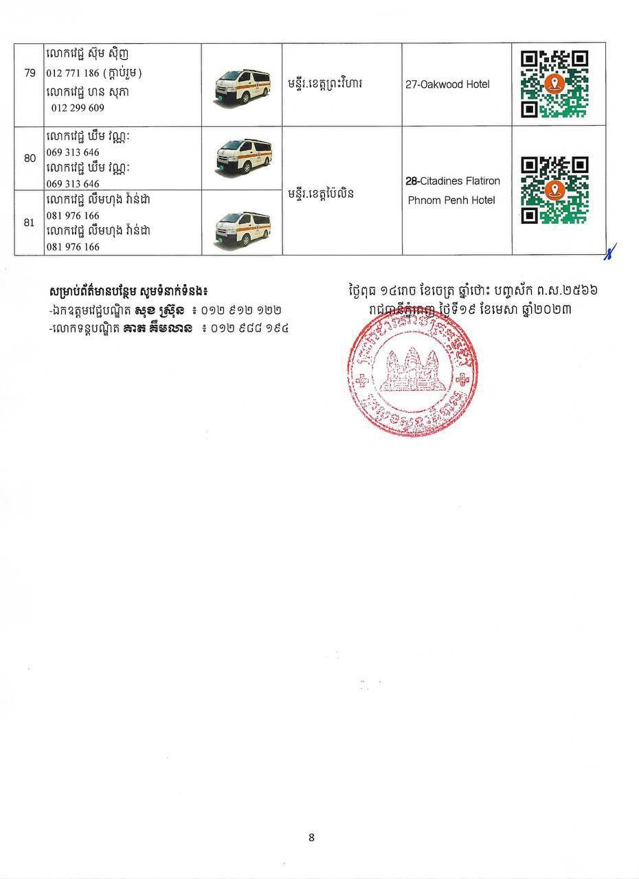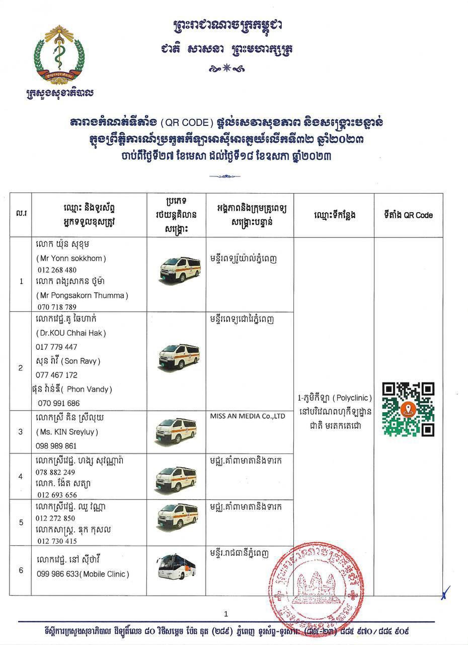 ក្នុងករណីបងប្អូនប្រជាពលរដ្ឋមានបញ្ហាសុខភាព សូមស្វែងរកសេវាសុខភាព និងសង្គ្រោះបន្ទាន់ដោយឥតគិតថ្លៃ នៅតាមទីតាំងដូចមាននៅក្នុងសេចក្តីជូនដំណឹងនេះ និងសូមជូនភ្ជាប់មកជាមួយនូវតារាងកំណត់ទីតាំង (QR CODE) ប្រភេទរថយន្តគិលានសង្គ្រោះ ឈ្មោះមន្ត្រីបុគ្គលិកទទួលខុសត្រូវ និងលេខទូរស័ព្ទតាមទីតាំងនីមួយៗ។ ក្រសួងសុខាភិបាលនឹងធ្វើបច្ចុប្បន្នភាពទីតាំងផ្តល់សេវាសុខភាព និងសង្គ្រោះបន្ទាន់តាមស្ថានភាពជាក់ស្តែង ៕