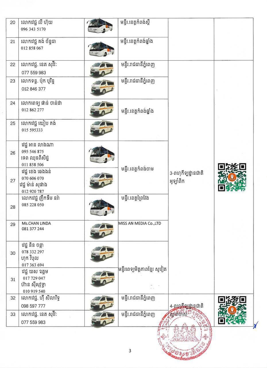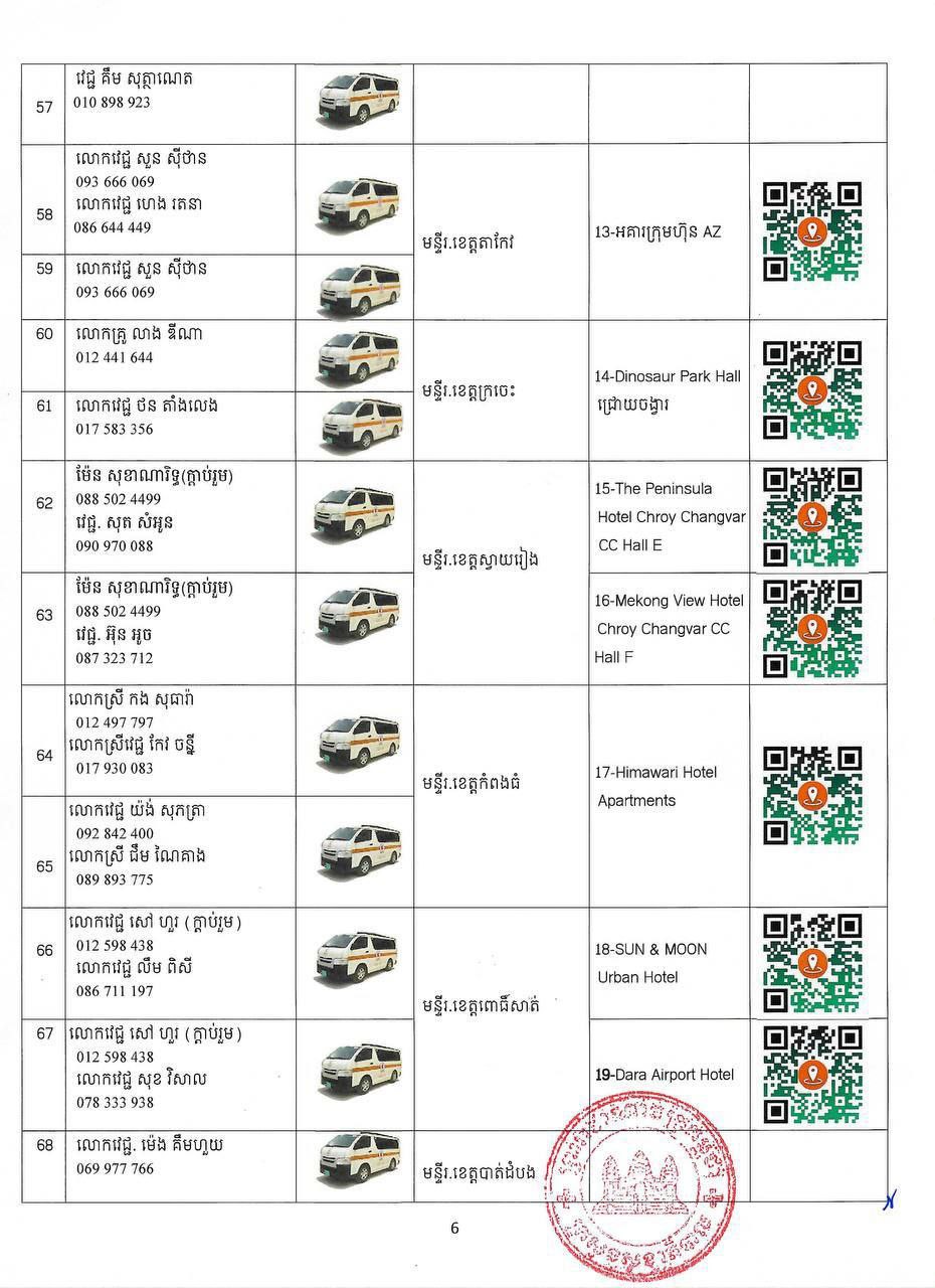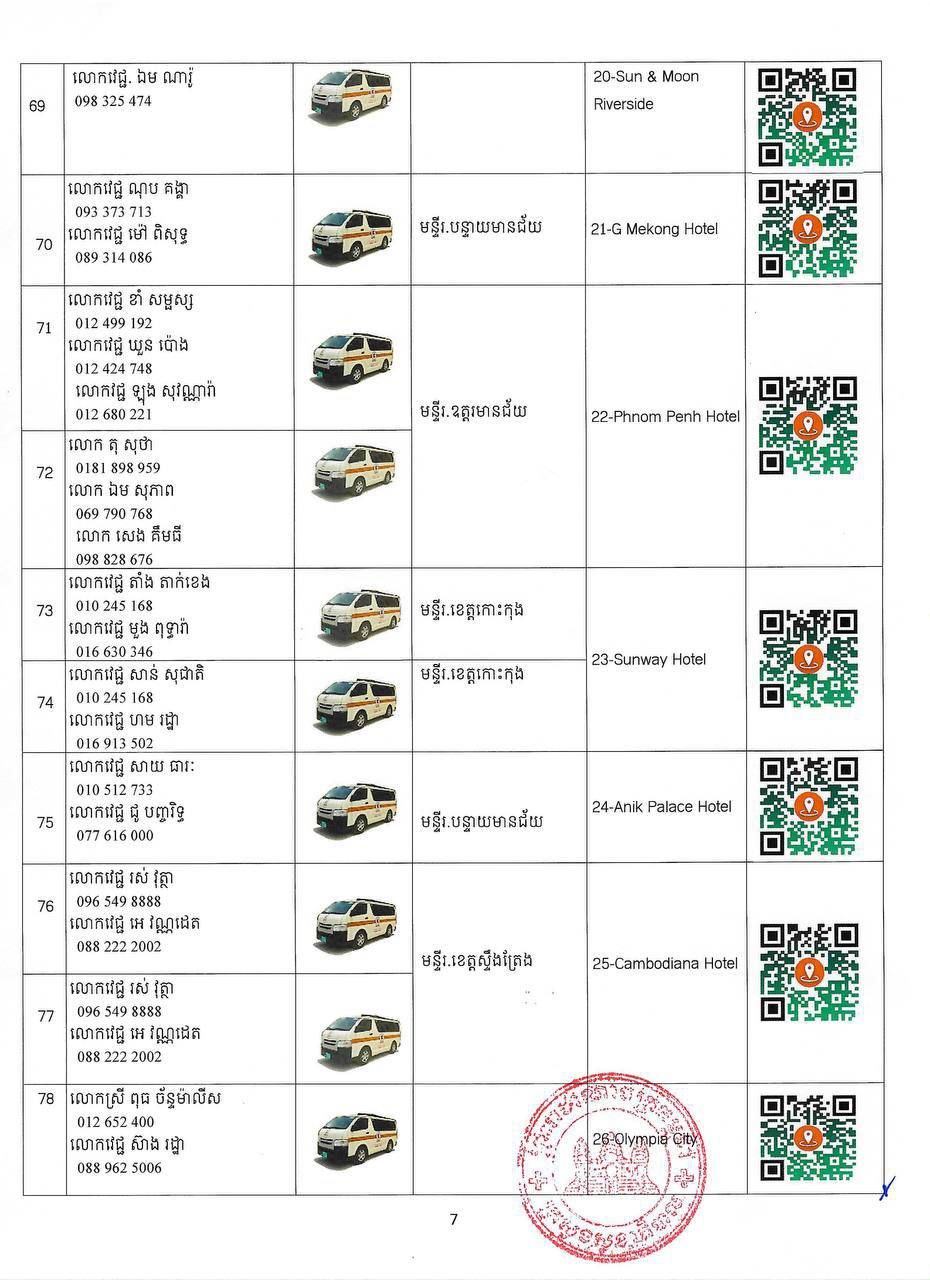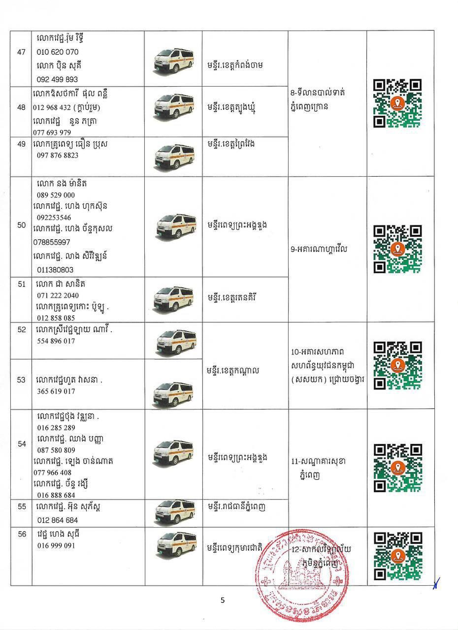 ក្នុងករណីបងប្អូនប្រជាពលរដ្ឋមានបញ្ហាសុខភាព សូមស្វែងរកសេវាសុខភាព និងសង្គ្រោះបន្ទាន់ដោយឥតគិតថ្លៃ នៅតាមទីតាំងដូចមាននៅក្នុងសេចក្តីជូនដំណឹងនេះ និងសូមជូនភ្ជាប់មកជាមួយនូវតារាងកំណត់ទីតាំង (QR CODE) ប្រភេទរថយន្តគិលានសង្គ្រោះ ឈ្មោះមន្ត្រីបុគ្គលិកទទួលខុសត្រូវ និងលេខទូរស័ព្ទតាមទីតាំងនីមួយៗ។ ក្រសួងសុខាភិបាលនឹងធ្វើបច្ចុប្បន្នភាពទីតាំងផ្តល់សេវាសុខភាព និងសង្គ្រោះបន្ទាន់តាមស្ថានភាពជាក់ស្តែង ៕