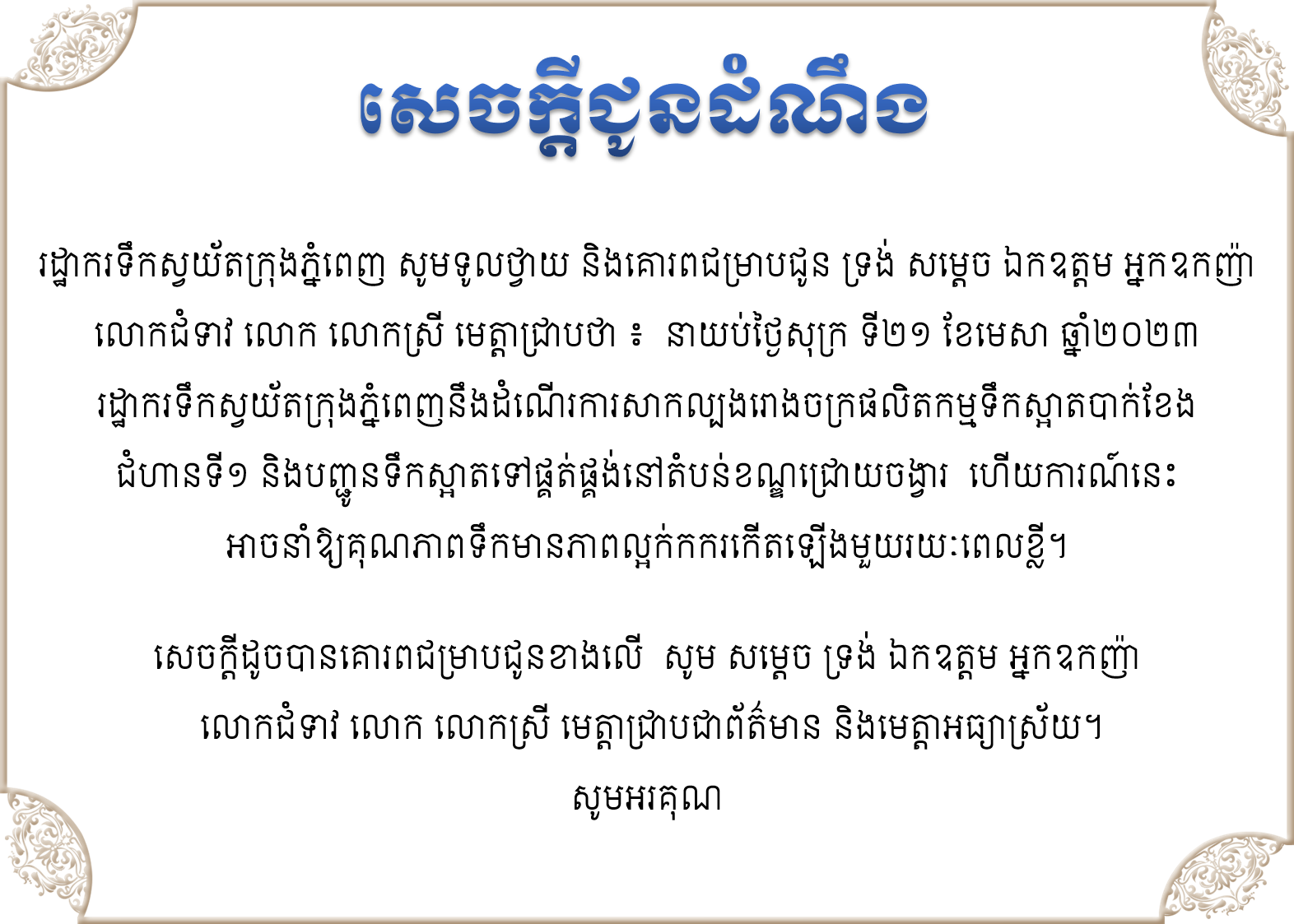 ហើយការណ៍នេះ អាចនាំឱ្យគុណភាពទឹកមានភាពល្អក់កករកើតឡើងមួយរយៈពេលខ្លី។ សេចក្ដីដូចបានគោរពជម្រាបជូនខាងលើ សូម សម្ដេច ទ្រង់ ឯកឧត្តម អ្នកឧកញ៉ា លោកជំទាវ លោក លោកស្រី មេត្តាជ្រាបជាព័ត៌មាន និងមេត្តាអធ្យាស្រ័យ ៕