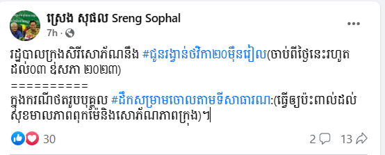 ខេត្តបន្ទាយមាន៖ នៅថ្ងៃទី២១ ខែមេសា ឆ្នាំ២០២៣ យោងតាមគណនីហ្វេសប៊ុកផ្ទាល់របស់ លោក ស្រេង សុផល អភិបាលនៃគណៈអភិបាលក្រុងសិរីសោភ័ណ បានប្រកាសថា បើមានអ្នកថតបុគ្គលដឹកសម្រាមចោលតាមទីសាធារណៈក្នុងមូលដ្ឋានក្រុងបាន នឹងជូនរង្វាន់ថវិកា ២០ម៉ឺនរៀល។