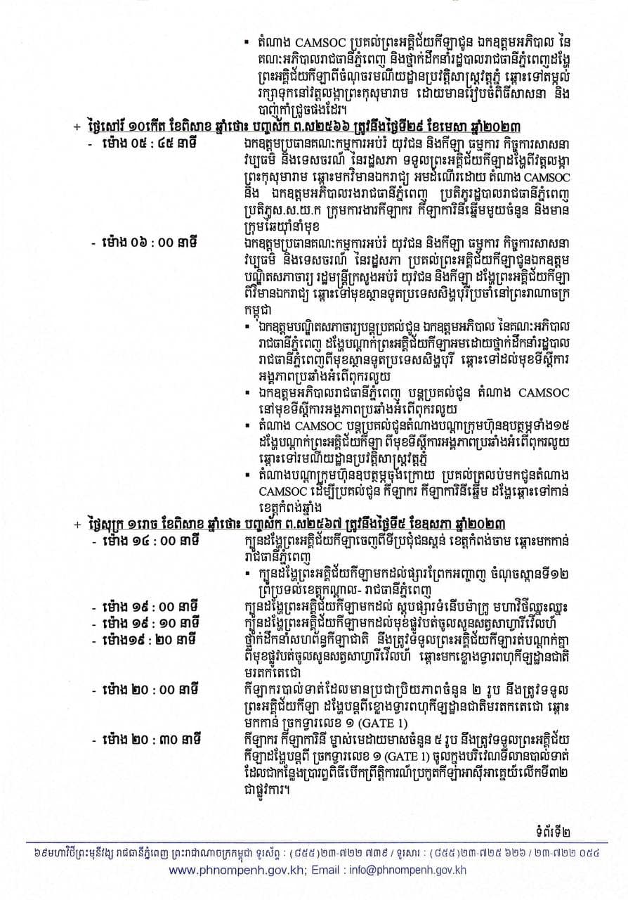 ចំពោះកម្មវិធីនៃការដង្ហែ ព្រះអគ្គិជ័យកីឡានៅរាជធានីភ្នំពេញនឹងប្រព្រឹត្តទៅដូចខាងក្រោម៖