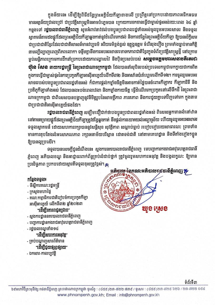 រដ្ឋបាលរាជធានីភ្នំពេញ មានកិត្តិយស សូមជម្រាបជូនដំណឹងដល់បងប្អូនប្រជាពលរដ្ឋទាំងអស់បានជបថា នៅថ្ងៃសុក្រ ៩កើត ខែពិសាខ ឆ្នាំថោះ បញ្ចស័ក ព.ស២៥៦៦ ត្រូវនឹងថ្ងៃទី២៨ ខែមេសា ឆ្នាំ២០២៣ ខាងមុខនេះ ព្រះអគ្គិជ័យកីឡា នៃការប្រកួតកីឡាអាស៊ីអាគ្នេយ៍ លើកទី៣២ និងកីឡាអាស៊ានប៉ារ៉ាហ្គេម លើកទី១២ ឆ្នាំ២០២៣ នឹងដង្ហែតាមរថយន្តពីខេត្តស្ទឹងត្រែងចូលមកដល់ភូមិសាស្ត្ររាជធានីភ្នំពេញ ត្រង់ចំណុចស្ពានទី១២ បណ្ដោយផ្លូវជាតិ លេខ៦ សង្កាត់បាក់ខែង ខណ្ឌជ្រោយចង្វារ នៅវេលាម៉ោង ១៧ និង ២០ នាទីល្ងាច។