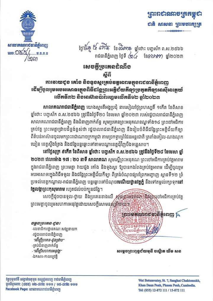 រាជធានីភ្នំពេញ៖ យោងតាមការចុះផ្សាយរបស់ សាលាគណរាជធានីភ្នំពេញ បានចេញសេចក្ដីជូនដំណឹង ស្ដីពីការវាយជួង រគាំង និងទូងស្គរគ្រប់វត្តអារាមក្នុងរាជធានីភ្នំពេញ ដើម្បីចូលរួមអបអរសាទរក្នុងពិធីដង្ហែព្រះអគ្គិជ័យកីឡាប្រកួតកីឡាអាស៊ីអាគ្នេយ៍លើកទី៣២ និងអាស៊ានប៉ារ៉ាហ្គេមលើកទី១២ ឆ្នាំ២០២៣។
