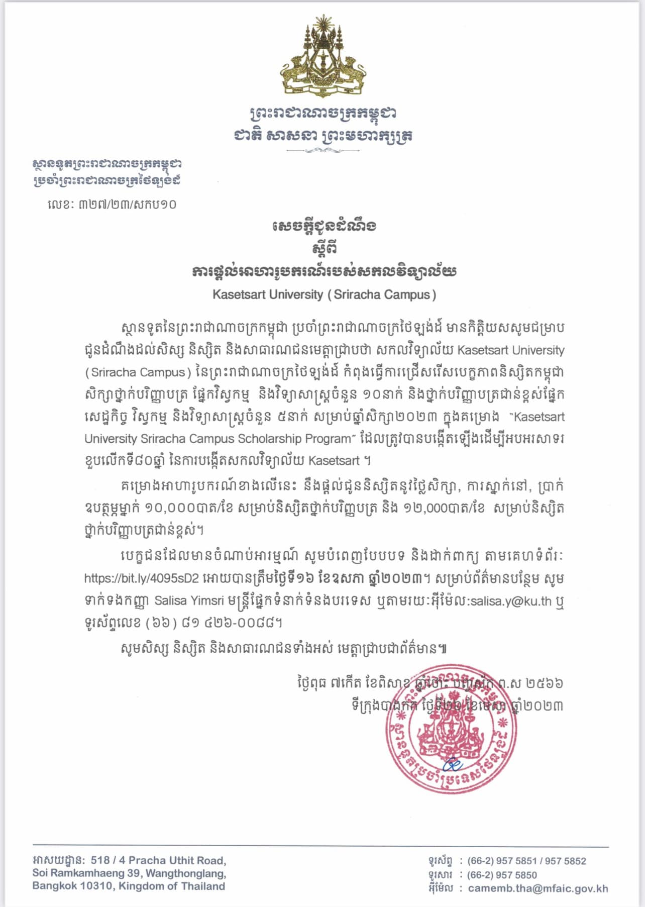 នៅថ្ងៃទី២៦ ខែមេសា ឆ្នាំ២០២៣ យោងតាមការចុះផ្សាយរបស់ ស្ថានទូតនៃព្រះរាជាណាចក្រកម្ពុជា ប្រចាំព្រះរាជាណាចក្រថៃឡង់ដ៍ មានកិត្តិយសសូមជម្រាប ជូនដំណឹងដល់និស្សិត និងសាធារណជនមេត្តាជ្រាបថា សាកលវិទ្យាល័យ Kasetsart University (Sriracha Campus) នៃព្រះរាជាណាចក្រថៃឡង់ដ៍ កំពុងធ្វើការជ្រើសរើសបេក្ខភាពនិស្សិតកម្ពុជា សិក្សាថ្នាក់បរិញ្ញាបត្រ ផ្នែកវិស្វកម្ម និងវិទ្យាសាស្ត្រចំនួន ១០នាក់ និងថ្នាក់បរិញ្ញាបត្រជាន់ខ្ពស់ផ្នែកសេដ្ឋកិច្ច វិស្វកម្ម និងវិទ្យាសាស្ត្រចំនួន ៥នាក់ សម្រាប់ឆ្នាំសិក្សា២០២៣ ក្នុងគម្រោង “Kasetsart University Sriracha Campus Scholarship Program” ។